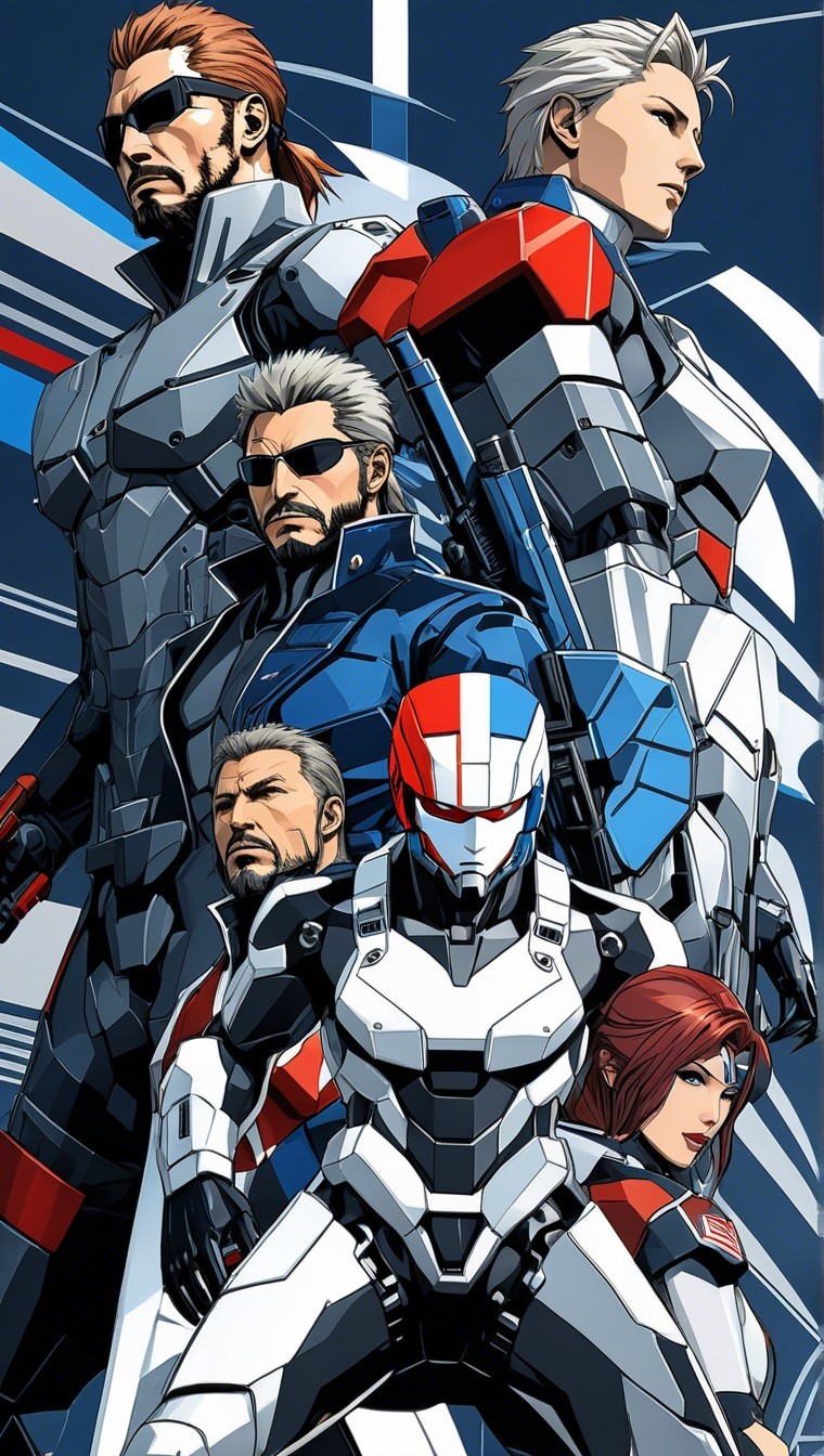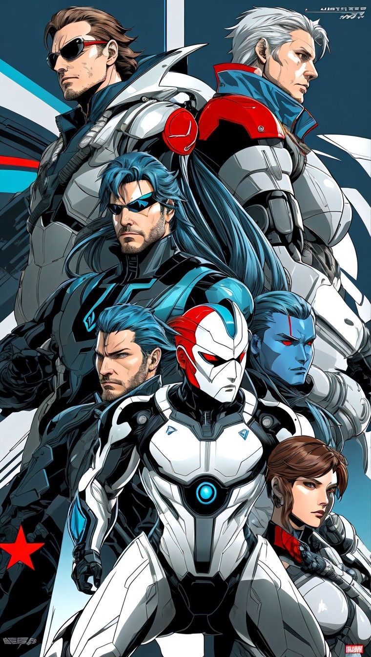 + Prompt:metal gear trio,, dynamic pose, art deco, cel shaded, irregular angle view, organic tropic cybernetic with futuristic modern silver blue white red colors, patriotic themed, defined, neat, contrast, detailed, realistic badass 3d illustration, comics art/extremely-ultra-detailed line-art. The artwork features high contrast, colorful, striking detailed art style, outline, no text
