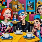 The image features a group of five women and children in a colorful café setting. They sit around a yellow table with cups of coffee, exuding a mix of curiosity and contemplation.