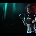 A focused female boxer stands in a dimly lit gym, wearing black gloves and a sports bra. She gazes intently at a red and black heavy bag, exuding determination and strength.