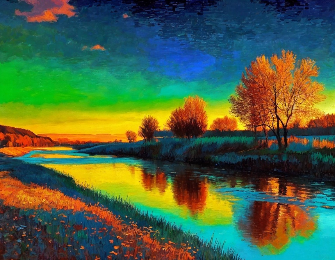 A serene riverside at dusk with golden sunset skies reflecting in calm waters, silhouettes of trees, and houses on the shore.