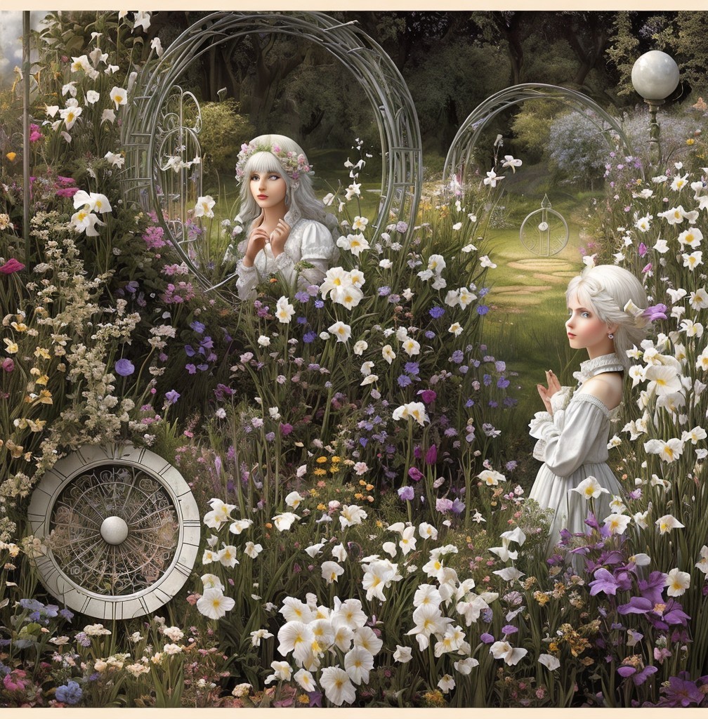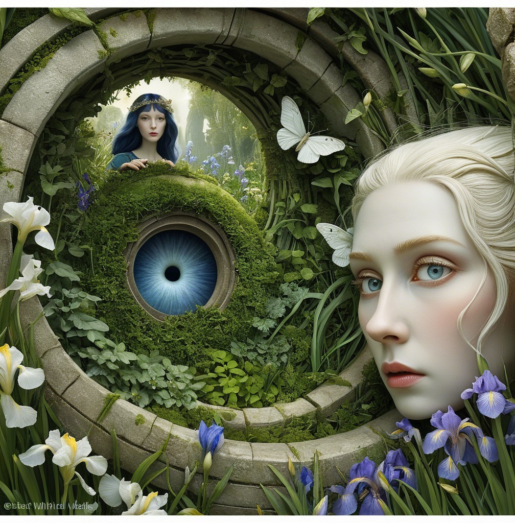 Close up, wild child of the Iris gorgeous white face creature staring into a portal in a garden maze, in the style of Alexander Jansson. by Catrin Welz-Stein, Michael Parkes. By Rob Gonsalves, Markus Pierson