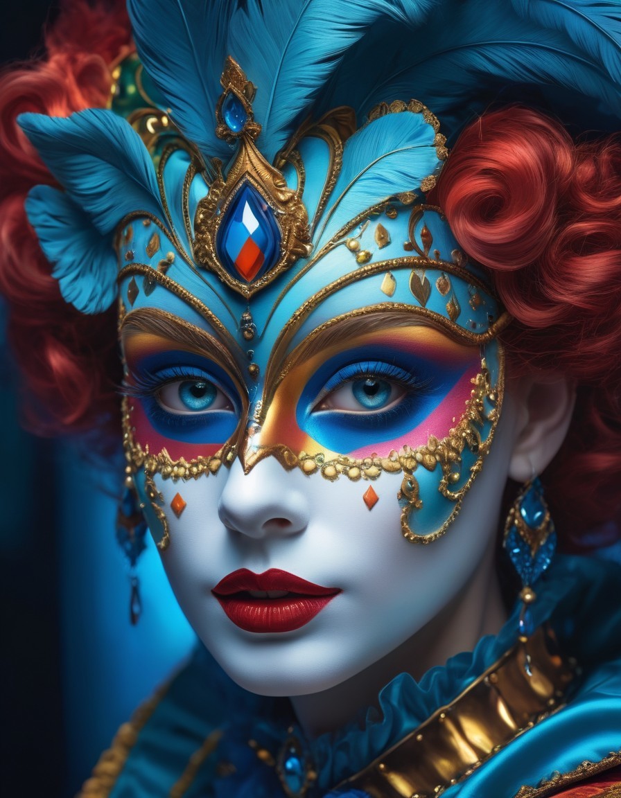 lofi biopunk portrait harlequin, digital painting, digital illustration, extreme detail, digital art, 4k, ultra hd, large luminous azure detailed eyes, porcelain half mask, cupids-bow lips