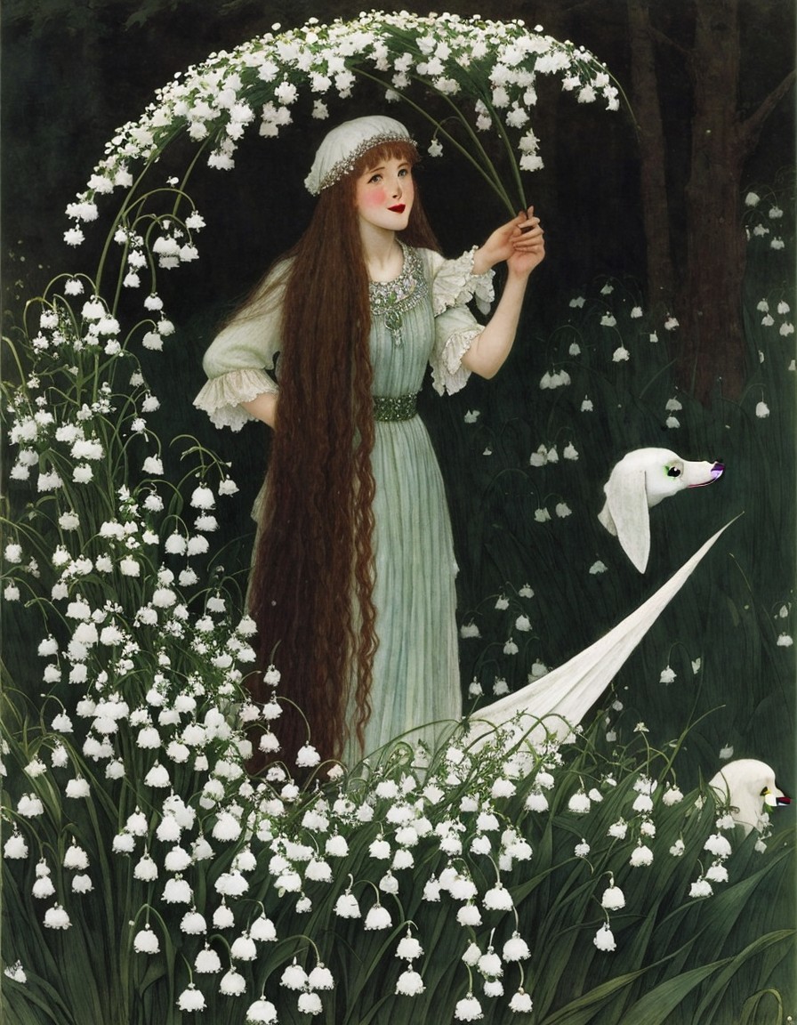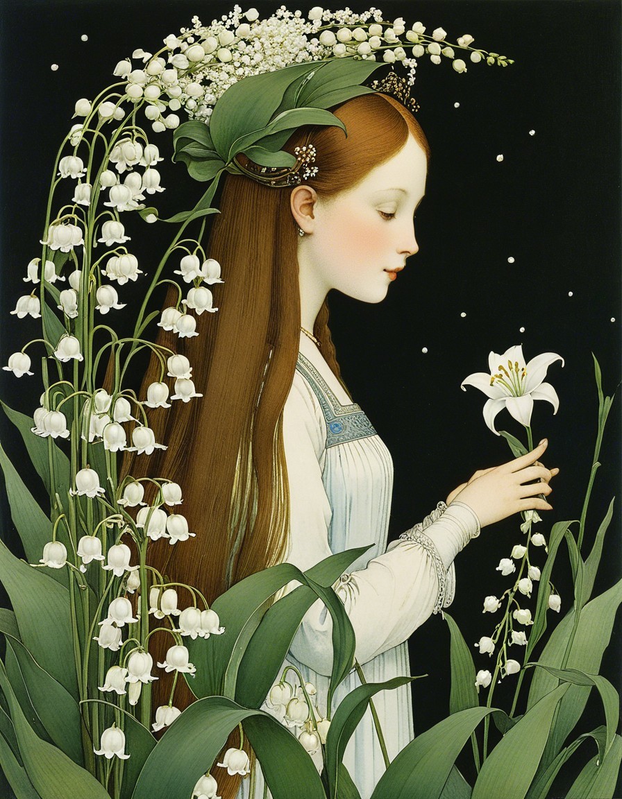 A serene young woman with long, flowing hair adorned with a crown of white flowers. She stands gracefully among lush green leaves and delicate lilies of the valley, radiating peace.
