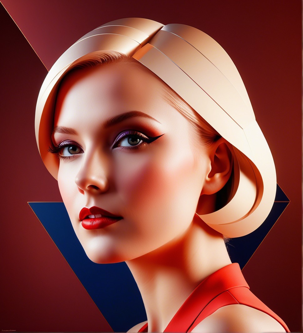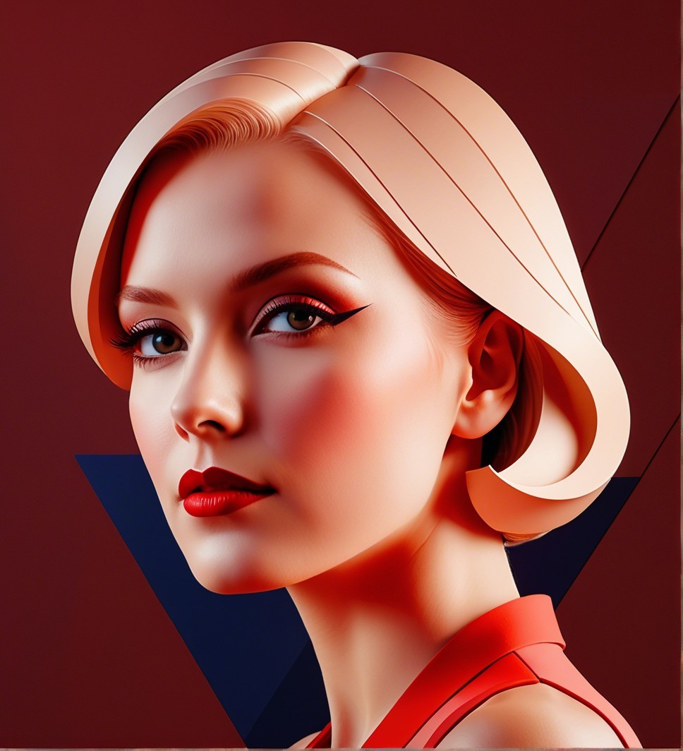 A glamorous portrait of a woman with a sleek bob hairstyle and bold makeup, featuring vibrant geometric shapes in a warm color palette that enhances her striking features.