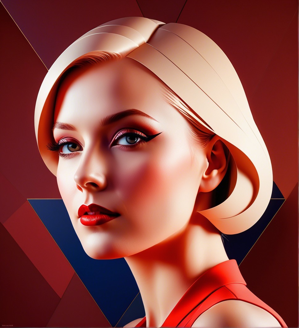 Prompt: Feminine portrait, silhouette, angled, stylized female headshot blending geometrical elements with bold lineage, featuring geometrical 3D effects, by Stan Lee and Ho Baron and William Bradley, rectangles in pale red hues, deep cobalt shades, warm tones, asymmetrical color gradients, Masterfully crafted Art Deco portrait, inspired by orphism, biomechanical intricacy, embodying a delicate balance between human fragility and mechanical precision. Keywords: porcelain-toned skin, layered biomech plating, sinewy cables, metallic seams, rusty wings, broken steel and bone structures, blackened wires, textured surfaces, polished chrome, corroded alloys, smirky eye expression, extended arm, organic-mechanical textures, shaped hairdo, fusion of design and decay, with hints of what once was, creating an eerie yet captivating atmosphere. The figure's eyes, hyper-realistic and expressive, convey a sense of ominous allure, drawing the viewer into a world where realism meets the surreal.executed in oil paint. The composition features flattened planes and intricate geometric facets. Emphasize flares, outlined contours, strong verticals, and fine-line diagonals. Include reflective surfaces with smooth gradients, achieving a lacquered sheen, stylized painting, high resolution, dof, bokeh, debeh, radiance, intricate details, dynamic lighting effects, bold and vibrant color palette, overall composition by Mark Rothko and Richard Serra, embodiment by Roy Lichtenstein and Willem de Kooning