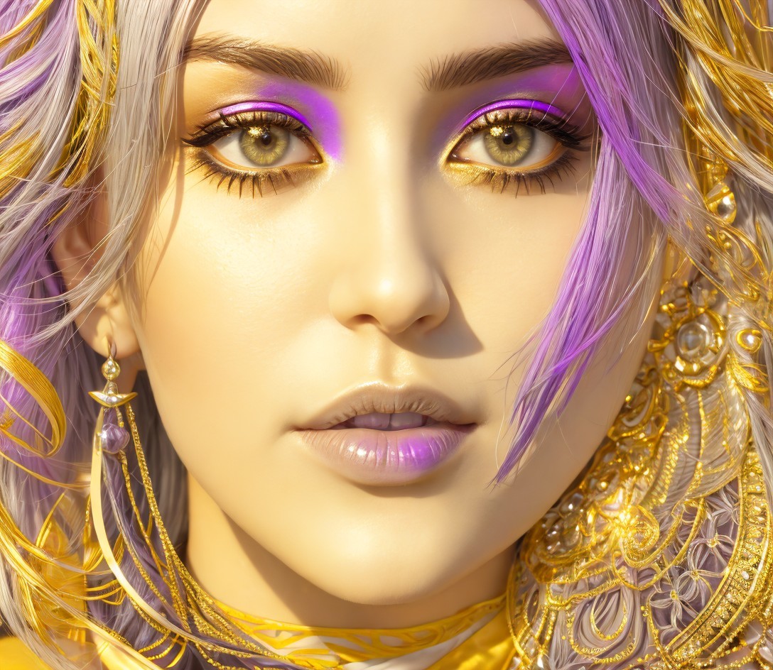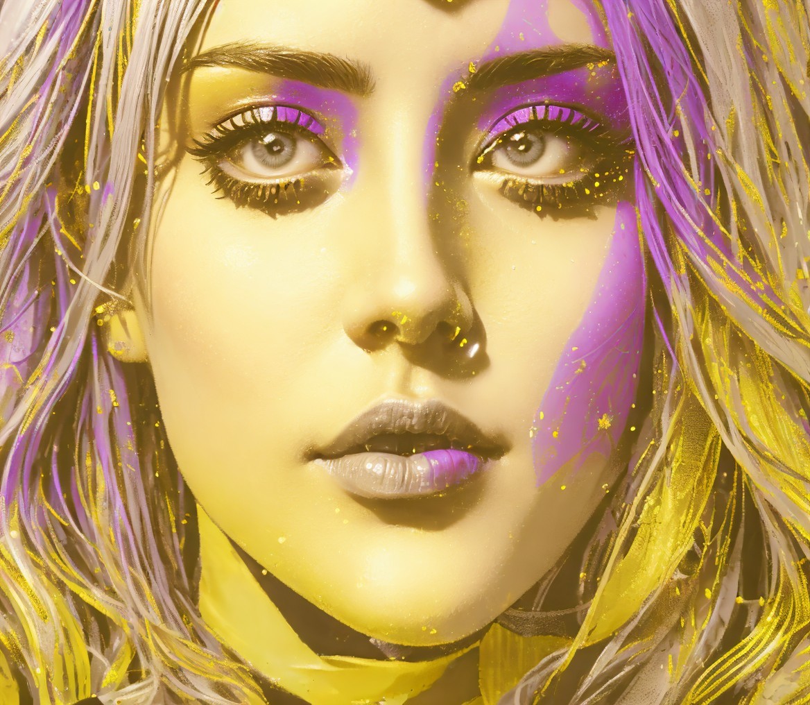 Close-up portrait, stylized lineage illustration, brightness 1.9, ambient occlusion 1.5, adorned, custom_loss: grey, triadic color scheme black purple yellow, magical realism, creamy, sweaty, crisp, tropical, golden rim lighting, ornamental strokes, fine lines 1.9, auracore 1.7, synthetic, tints of 1970s advertising art, beautiful artwork, stylized lineage surrounding, Schreger lines, luminous iridescence, volumetric lighting, intricate ornamental details 1.9, detailed hairdo, realistic eyes, spiritual essence, encaustic strokes, inkpunk 1.8