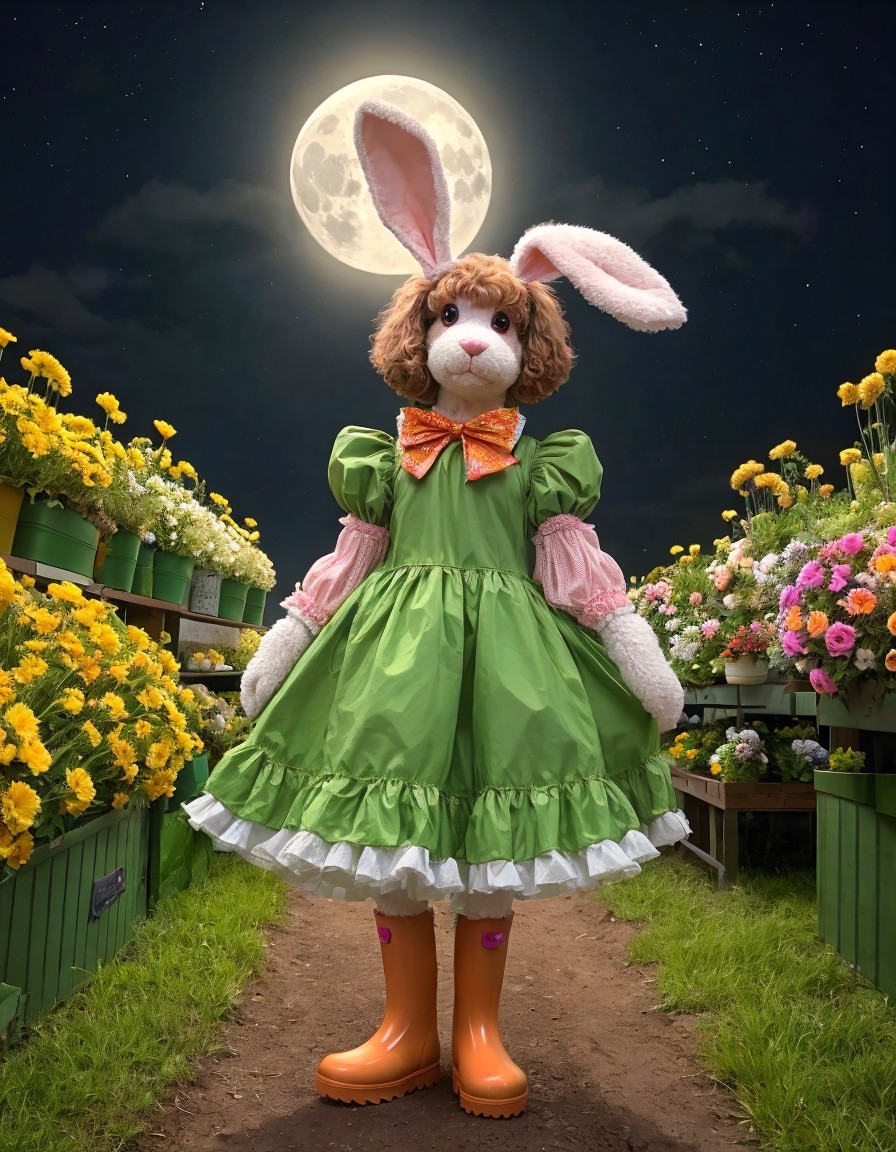 Prompt: "Anthropomorphic, humanoid: easter bunny big brown humanoid Poodle, wearing a green gardener's dress, green gardener's clothes, orange rubber boots on feet, standing in the dark, at night, full moon, wearing yellow gloves, spring feeling, standing in a beautiful huge flower shop at night, yellow flowers, red flowers, pink flower, plants, (anthropomorphic), humanlike, anthropoid, anthropomorph, chimera, full body, head to toe, (no human face)"