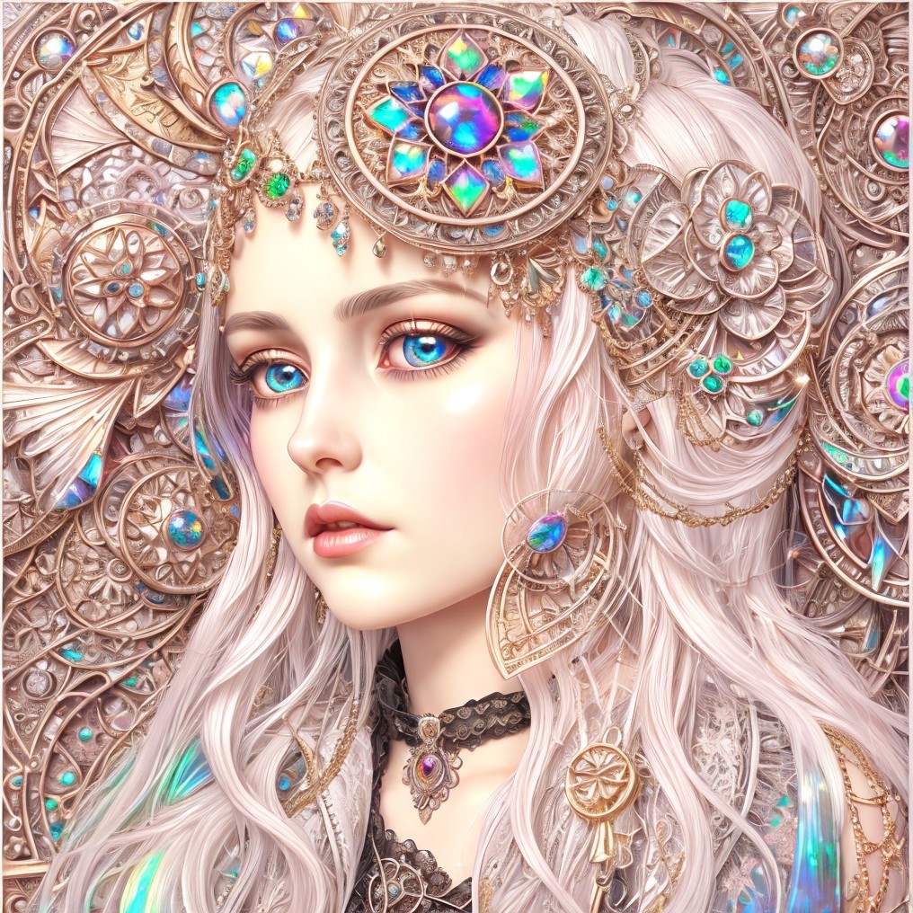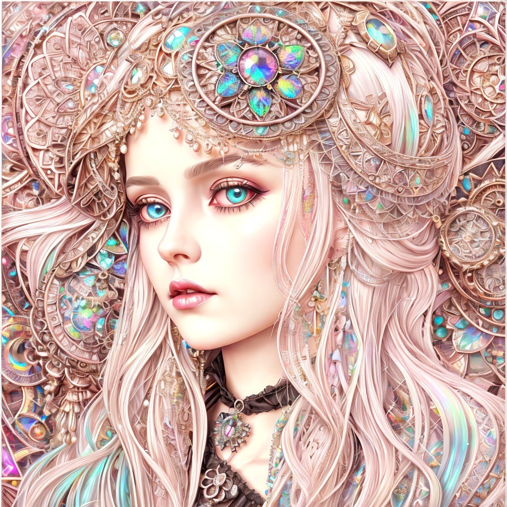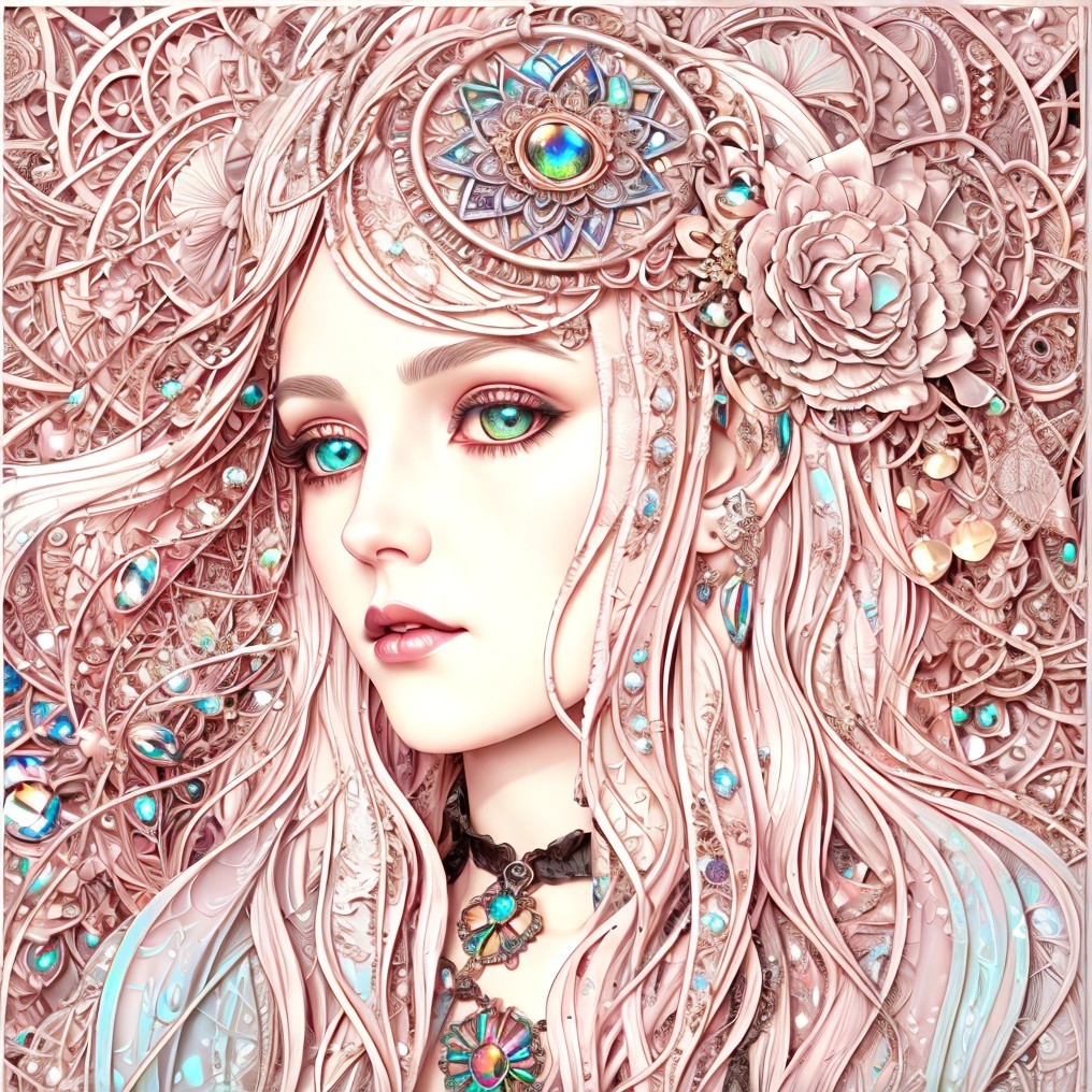 Prompt: Stylized portraiture, Victorian gothic girl with pale face and jewelry., dystopian Science fiction. Large eyes. Detailed body. Psychedelic colors. 3d effects 1.8, ambient occlusion 1.5, perfect handsface, cel-shaded, golden ratio, colorful iridescence, Pop art merged with sketch art, geometrical illustrative style , ameeican gothic, tetradic color scheme red pink beige purple, style of Susan Seddon Boulet, Overton Loyd , Paul_klee, margaret Keane, Georgia_O'Keefe and William Turner, line-art, watercolor and ink details, smooth, dreamy, ethereal, intricate contrast between the woman's sharp features and the soft painted background. maximalism, intricate and realistic portrait, soft rounded edges, high definition, 252525,, in the style of pixelated realism, iconic album covers, sculpted, fragmented, figura serpentinata, scattered, calligraphy art, zentangle method, beautiful artwork, stylized details, varnish, plasticity 1.6, complexion 1.4, brightness 1.9