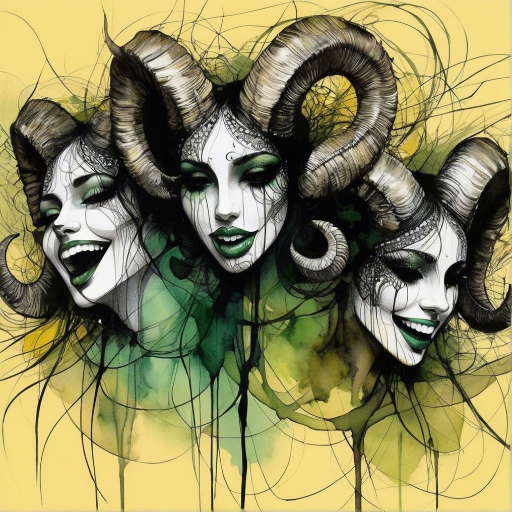 This vibrant artwork features three stylized female faces with bold expressions and intricate ram horns. Green hues and fluid paint drips create a lively, surreal atmosphere.
