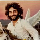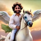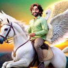 A majestic scene of a woman in green riding a winged horse through golden fields, illuminated by a swirling, fiery sky, capturing a sense of freedom and ethereal beauty.