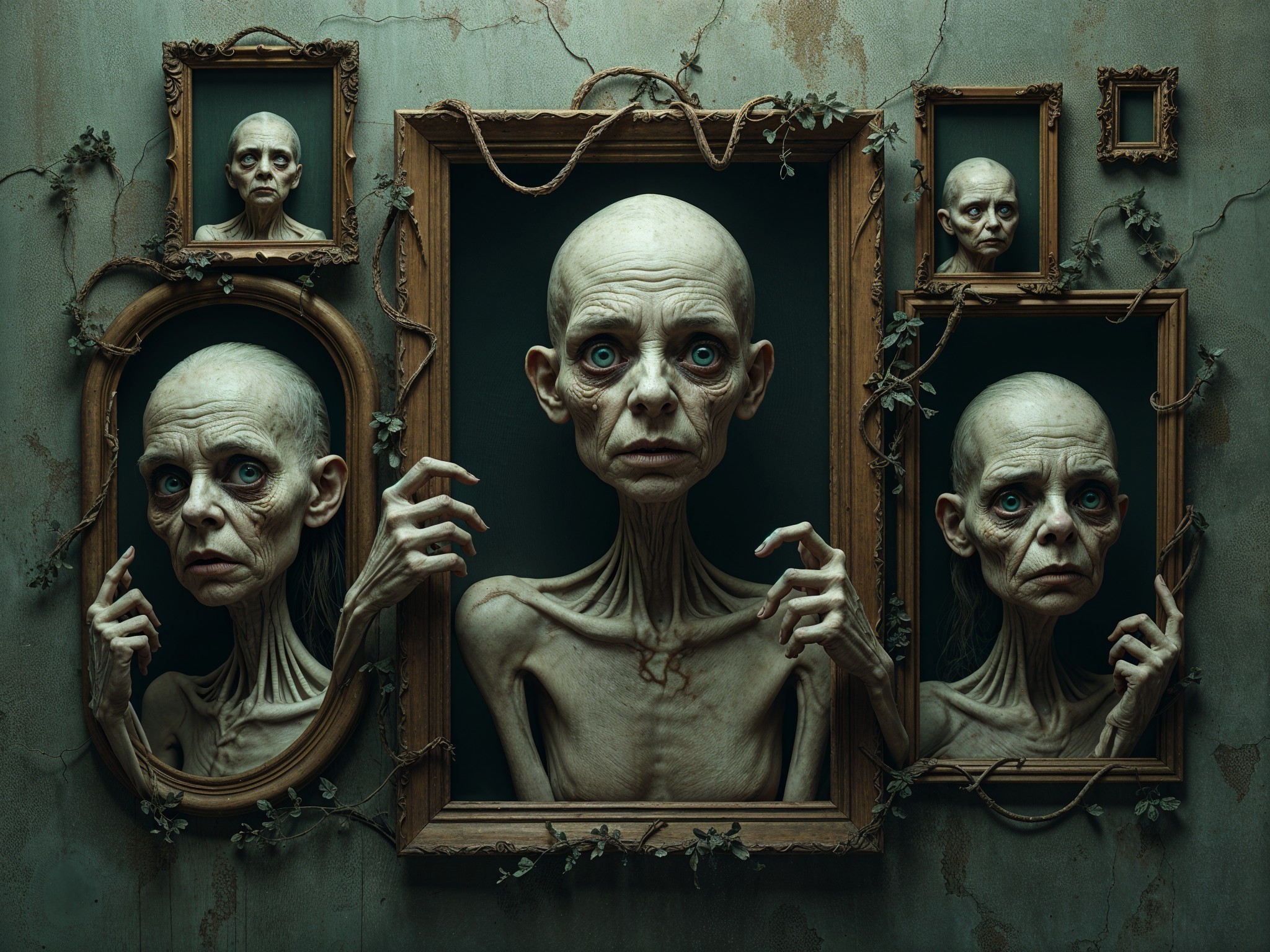 Prompt: "A dark and surreal scene of multiple elderly women framed within a wall of distorted and decayed picture frames. The background is a muted, greenish color with cracks, dirt, and signs of deterioration. The women in the frames have deeply wrinkled skin, gaunt skeletal features, and large, glassy, vacant light blue eyes. Their expressions convey deep sorrow, fear, or despair. The picture frames are twisted, broken, with vines or tendrils growing over and through them, adding to the decayed atmosphere. The central figure's head protrudes from her frame, with thin, bony fingers clutching the edge as if trying to escape or reach out to the viewer. The surrounding figures appear to be watching her or staring blankly. The color palette is dark and muted, dominated by shades of green, brown, and gray, with subtle use of shadow and light to enhance the eerie, otherworldly atmosphere."