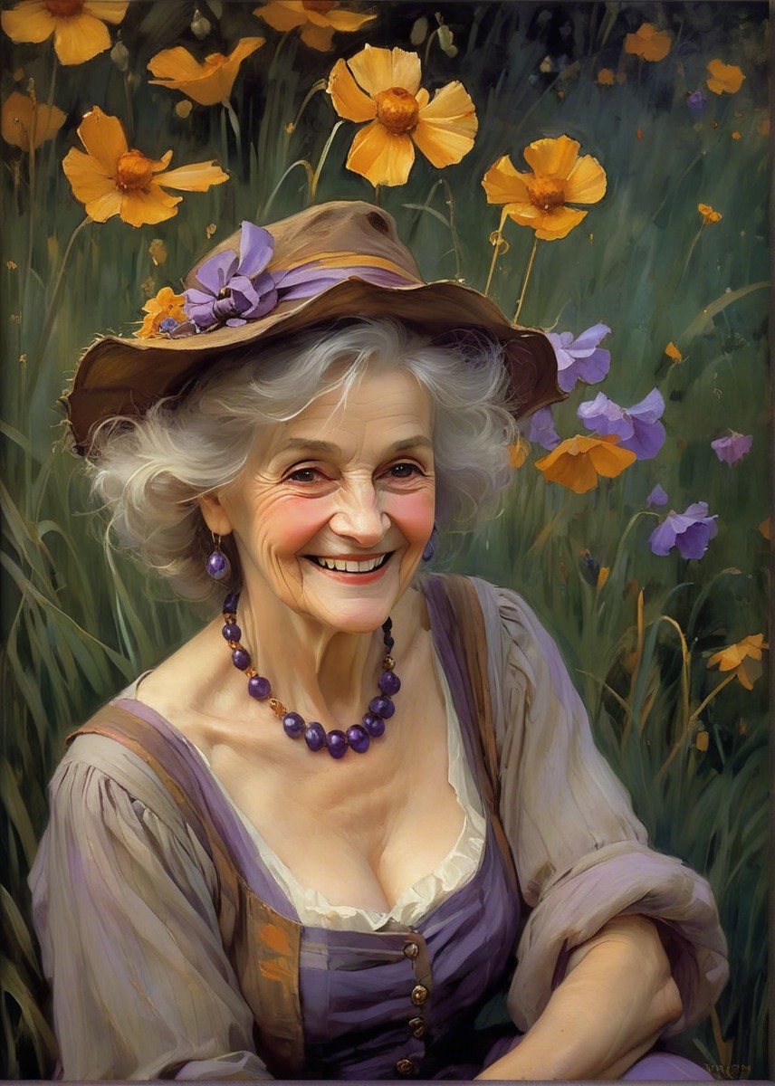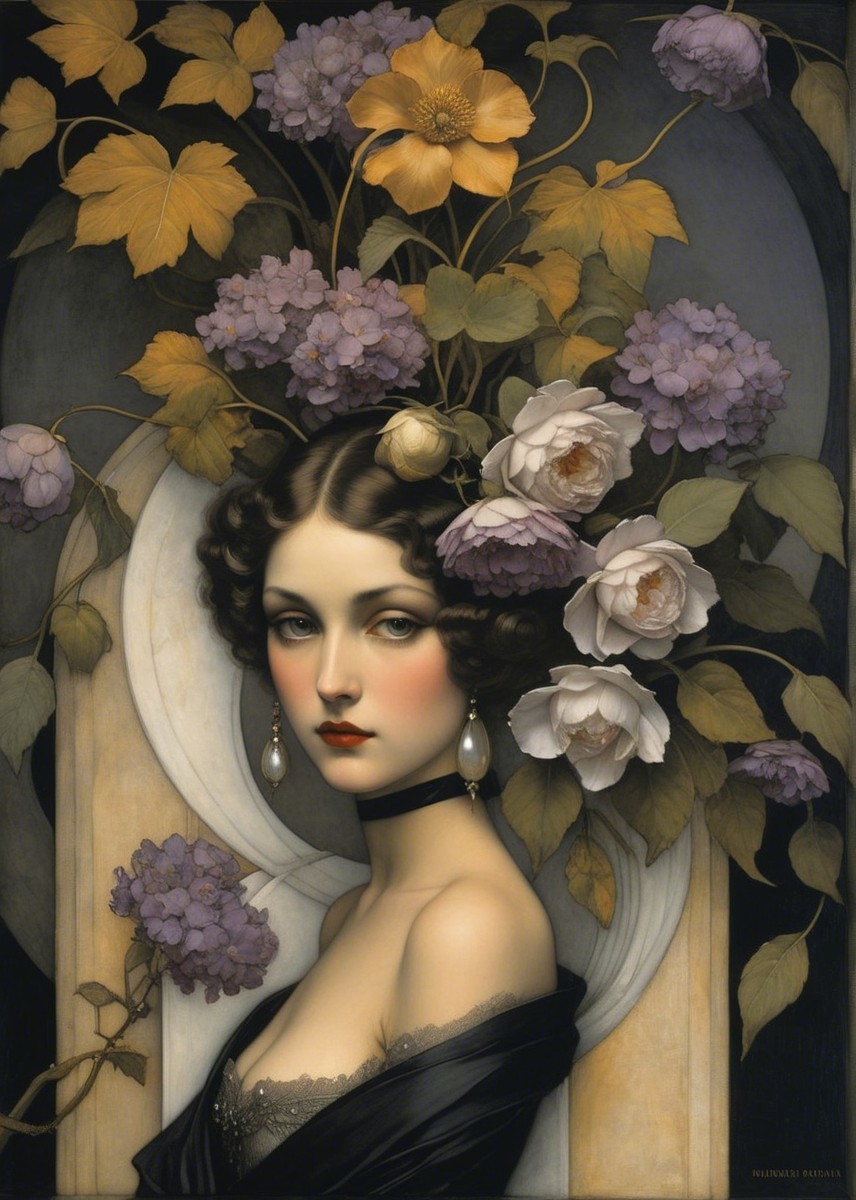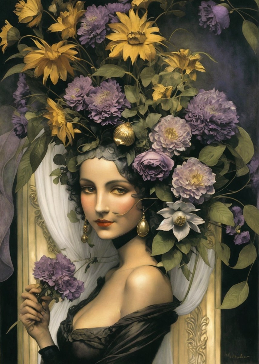 The image features a glamorous woman with blonde curls, wearing a stylish black dress and a hat adorned with orange butterflies. A serene landscape serves as a backdrop, enhancing her elegance.