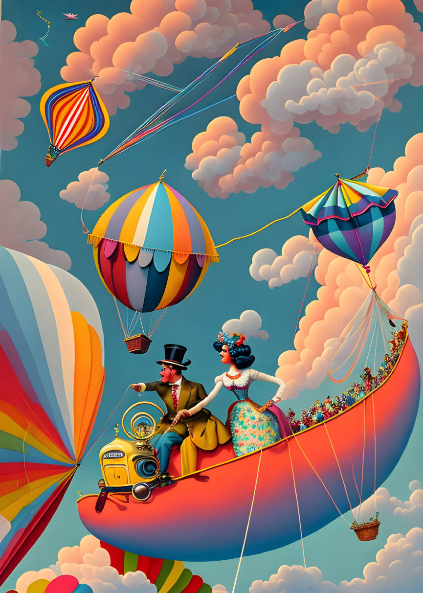 + Prompt:Quirky Vintage characters flying silly kites made from funny garments, Unconventional, way-out, weird, and whimsical, poster illustration, by Terry Gilliam, cartoon style illustration, no text, no signatures, ultra colorful, whimsy, cheery cartoon clouds, view of people on the earth below, highly busy composition, eye-candy, vintage Terry Gilliam cartoon illustration