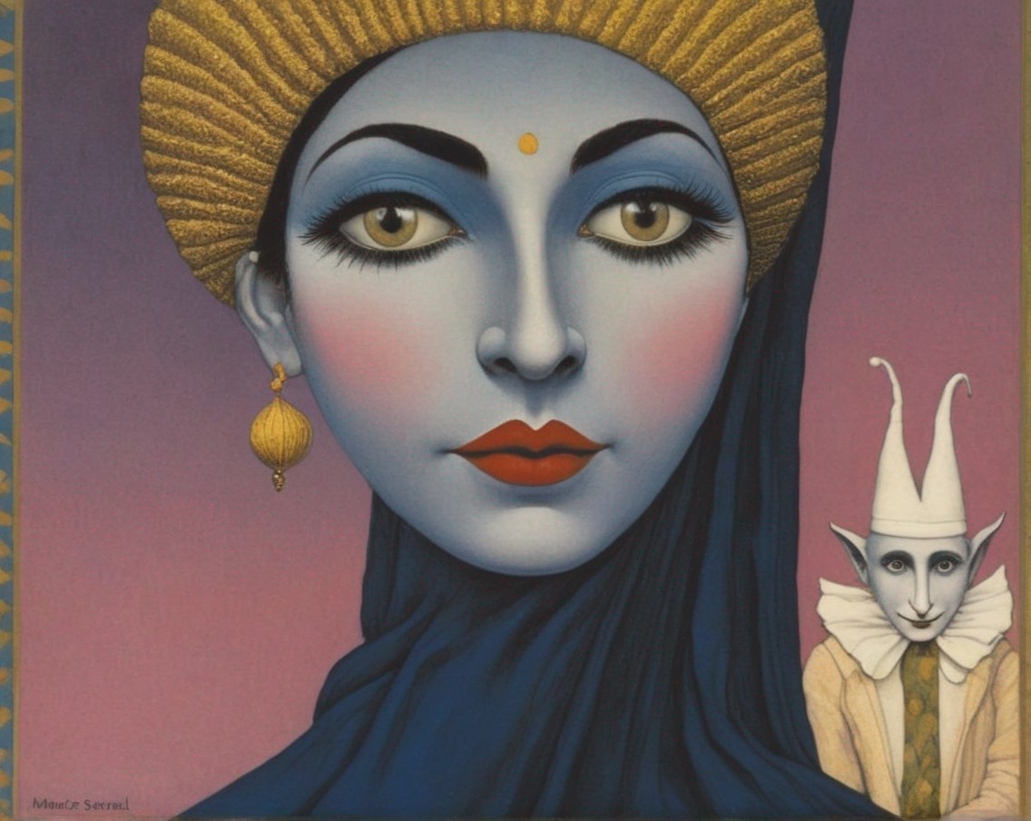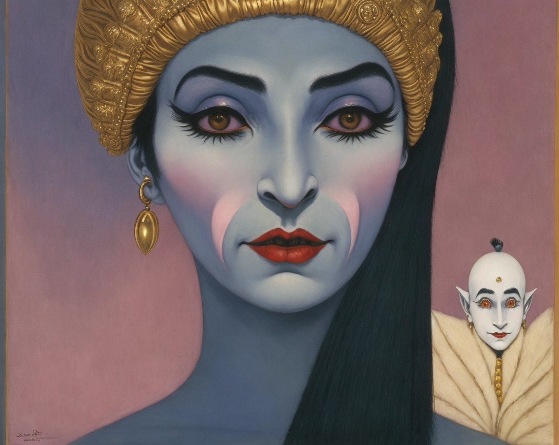 An illustration of two clown-like figures with exaggerated facial features and period ruffled costumes against a pink backdrop.