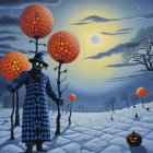A stylized metallic humanoid figure stands in a vibrant, patterned room filled with large spheres in red, gold, and black, creating a striking contrast with the geometric background.
