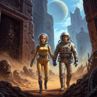 In a desolate, alien landscape, two astronauts—one in a yellow suit and the other in a classic space suit—walk hand in hand amid towering ruins and eerie, shadowy creatures.