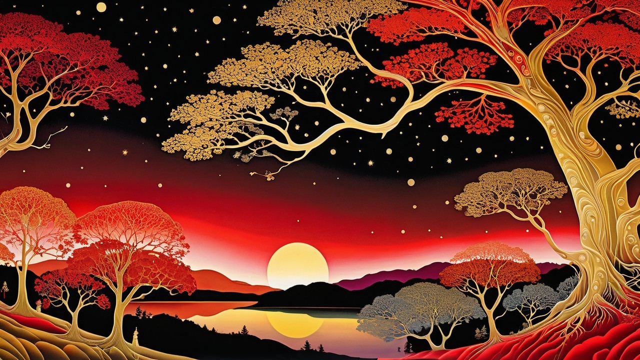 A vibrant sunset scene featuring golden and red trees silhouetted against a starry sky. The sun sets over tranquil waters, creating a serene and colorful landscape.