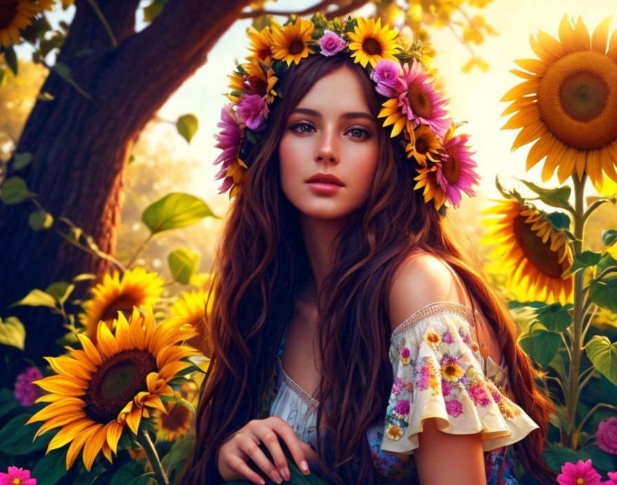 Woman with floral headband surrounded by sunflowers and wavy hair.