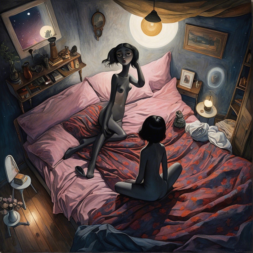 The image depicts a surreal scene in a dimly lit bedroom. A woman with flowing hair sits on a bed, while a young girl, both nude, gazes at her, surrounded by clocks, lamps, and framed pictures.
