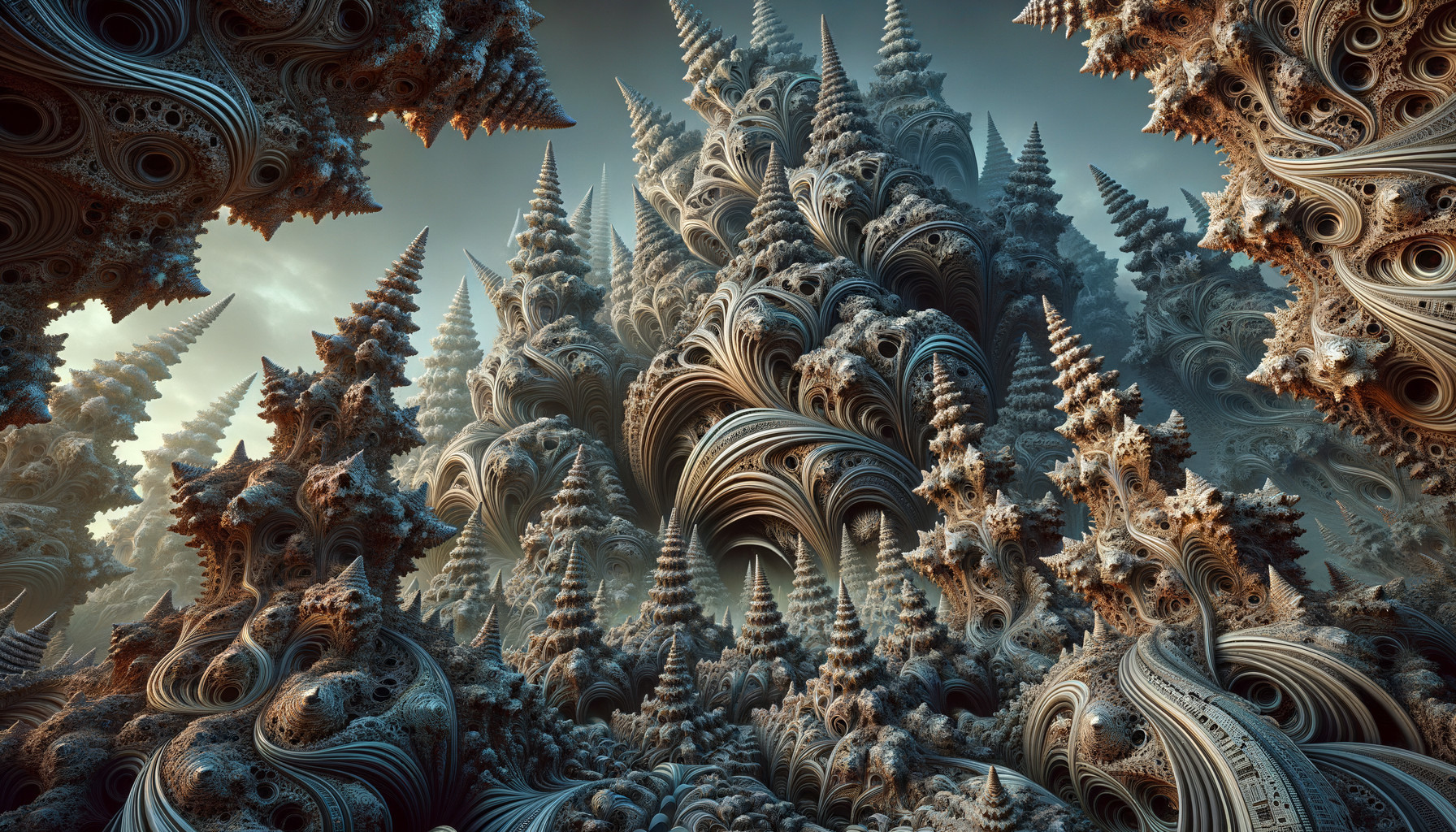 Surreal landscape with intricate, fractal-like structures resembling organic and coral formations under a soft-lit sky.