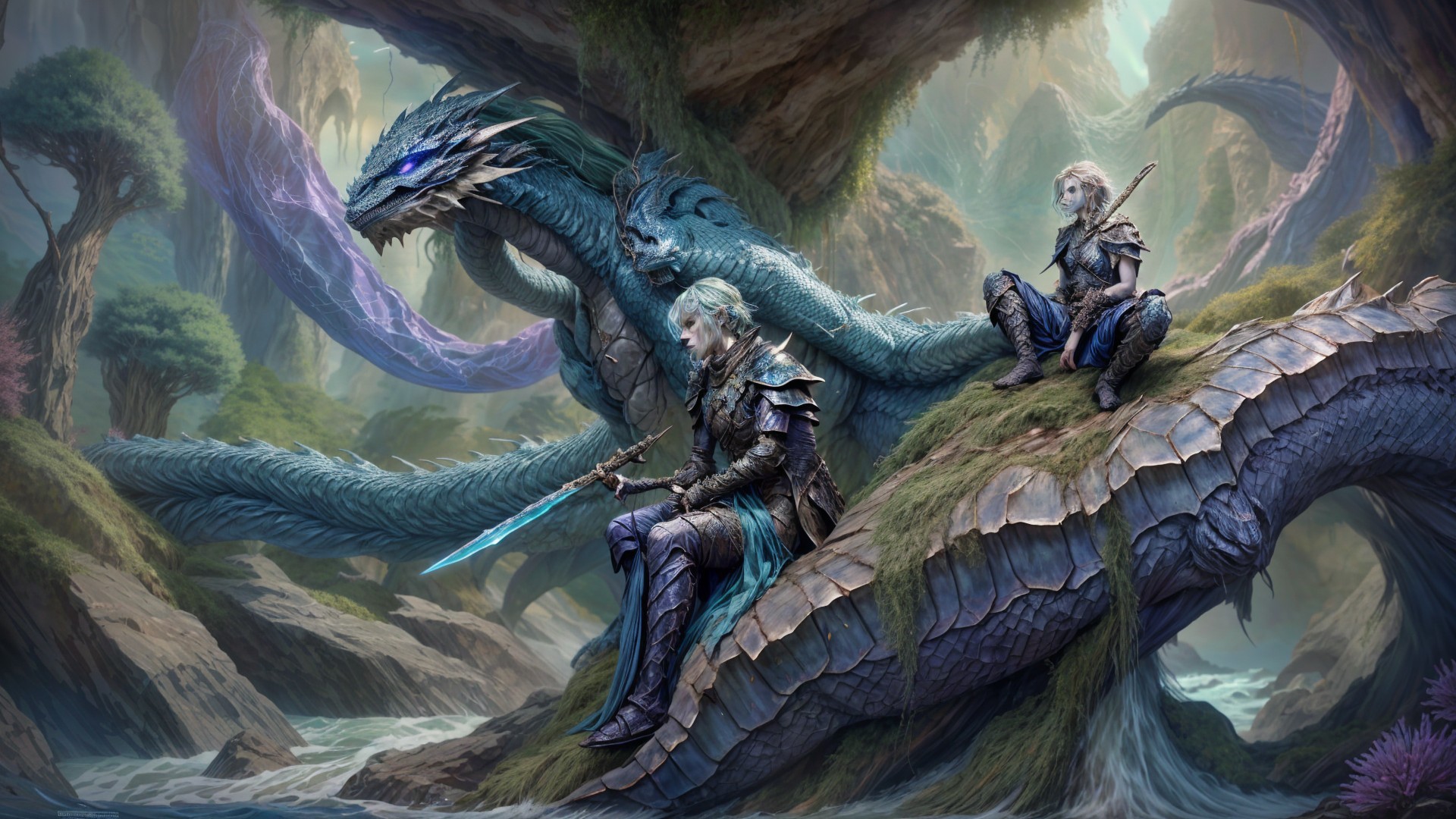 A majestic scene featuring a regal figure in flowing blue attire, riding a powerful blue dragon along a rocky coastline, with lush greenery and dramatic cliffs in the background.