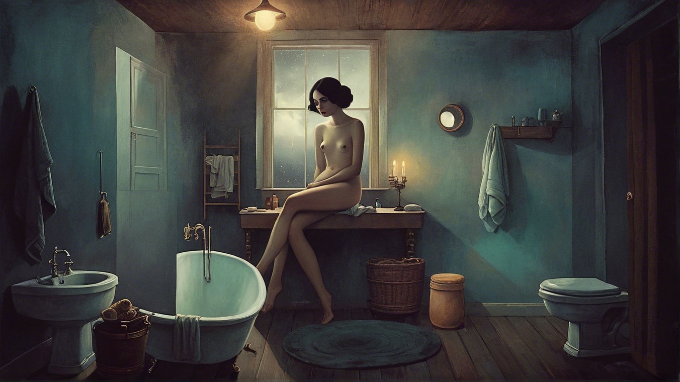 A serene bathroom scene features a woman standing by the mirror, illuminated by soft light. The vintage decor includes a clawfoot tub, a wooden vanity, and elegant wall art, creating a tranquil atmosphere.