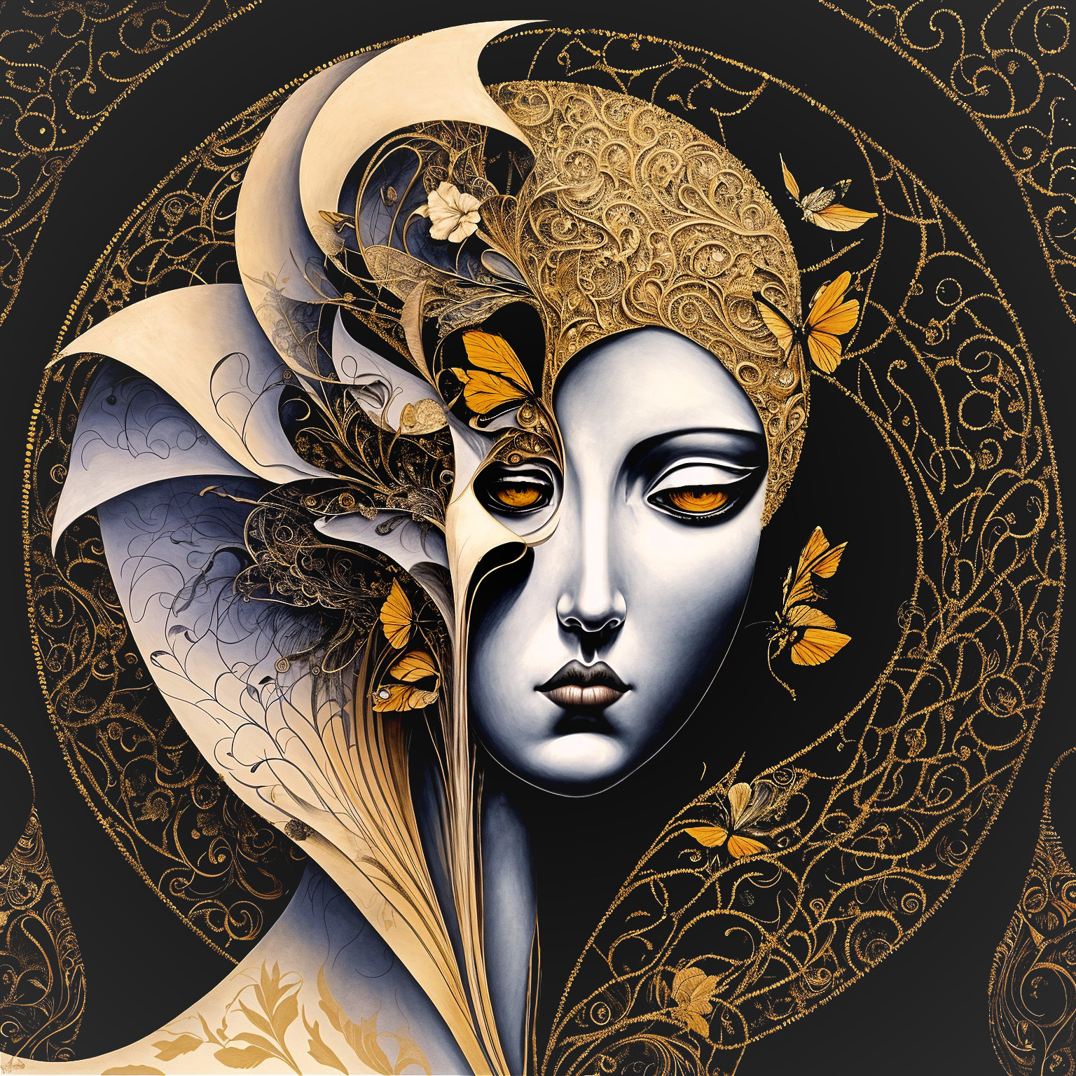 The image features a stylized female face emerging from intricate, swirling patterns in gold and black, surrounded by delicate butterflies and floral elements, creating a mystical and artistic vibe.