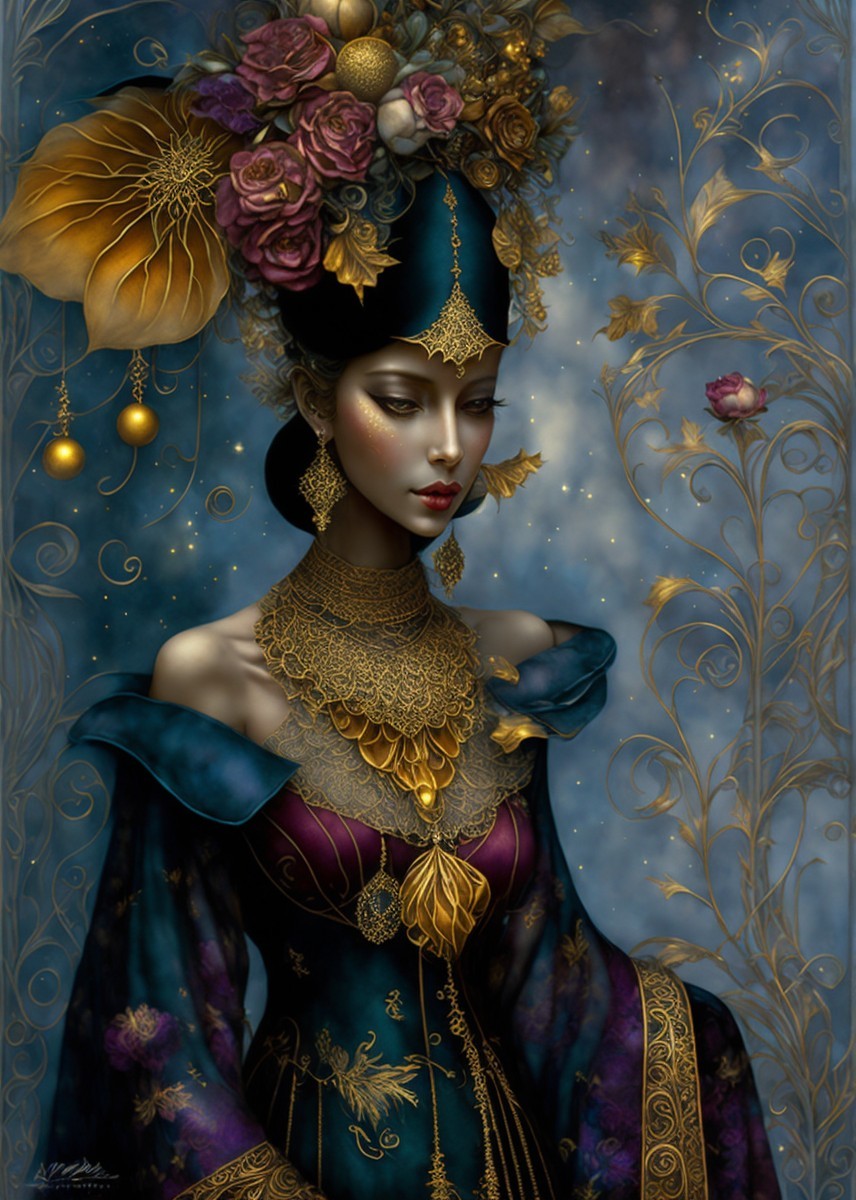 An illustration of a woman with ornate golden headdress and jewelry, wearing a black gown against a starry, night-sky backdrop.