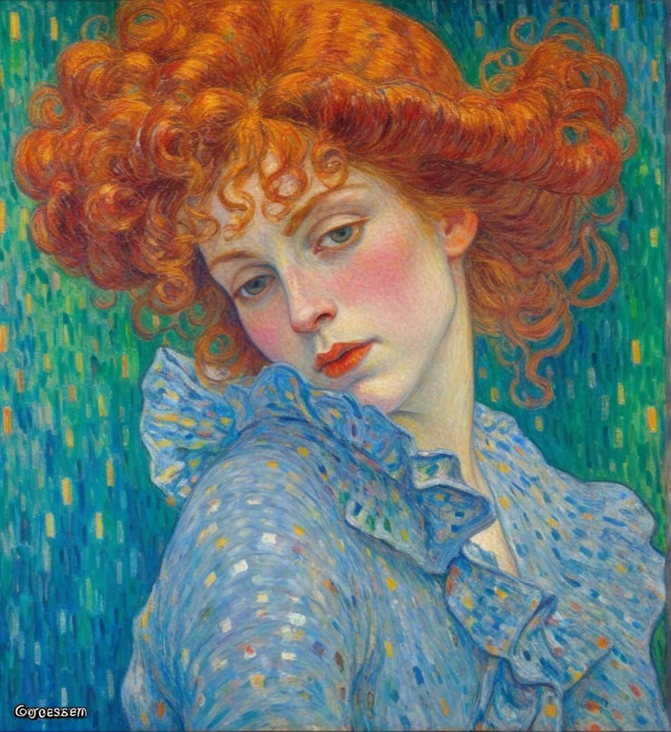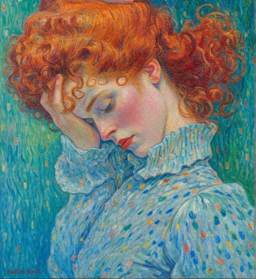 A young woman with vibrant red curls gazes downward, dressed in a light blue blouse adorned with colorful dots and buttons. The background features a dynamic pattern of green and blue hues.