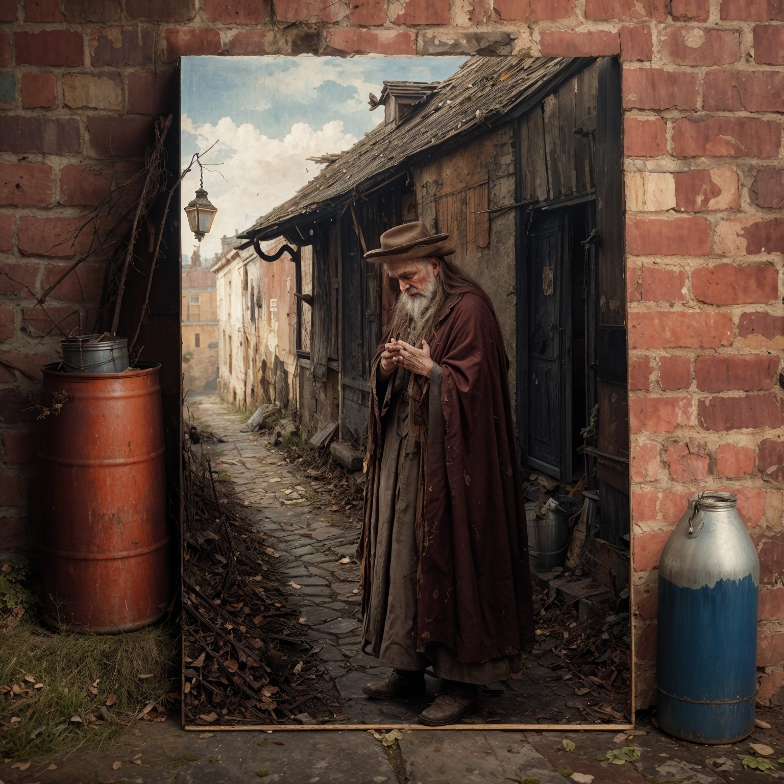 Prompt: "Mysterious folk art cracked oil painting masterpiece, hand-painted antique canvas, cinematic photo inspiration, very OLD dirty KING, cobblestone road setting, brown weeds, dead leaves, broken bottles, rusted cans, gray sack, dirty red royal robe, torn, sad expression, troubled demeanor, rusty bent crown, disheveled hair, buzzing flies, barefooted, hazy lazy summer day ambiance, moody backdrop, dark clouds, drifting dust, mysterious enchantment, fine detailed structures, uncertain textures, color scratches, tears, cracks in paint, Gabriel Pacheco style, extreme canvas texture, brown, tan, desert orange, faded yellow, old dirty red, soft green, pale blue sky, sandy mist blend, oil on canvas medium, award-winning quality, 4K 3D resolution, eerie atmosphere, regal aura, ancient vibes, courage theme, haunted feel, heroic presence, unusual elements, end of the world concept, authentic touch, profound essence, antique lighting, bravery depiction, no exit from life symbolism, intricate details, Saintly aura, eerie oil painting, intricate, high detail, eerie, Epic, eldritch, Atmospheric, melancholic, haunted, endless, Unusual, end of the world, Authentic, Profound, Gothic atmosphere, Crossroads, Masterpiece quality, oil on canvas, melancholic, Profound, Wistful, Antique light, oil on canvas, Impressionist oil painting."