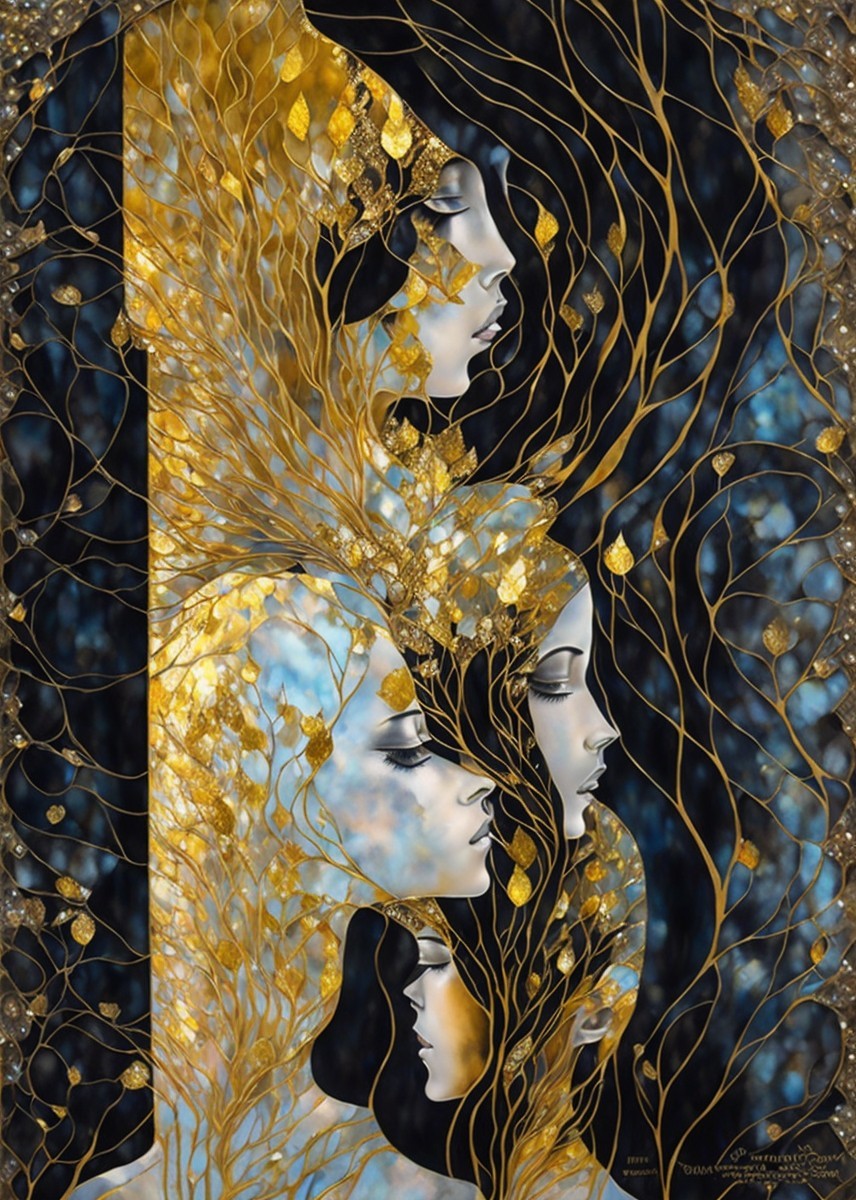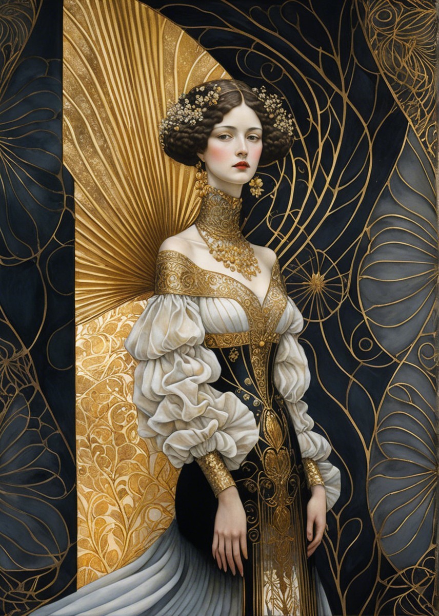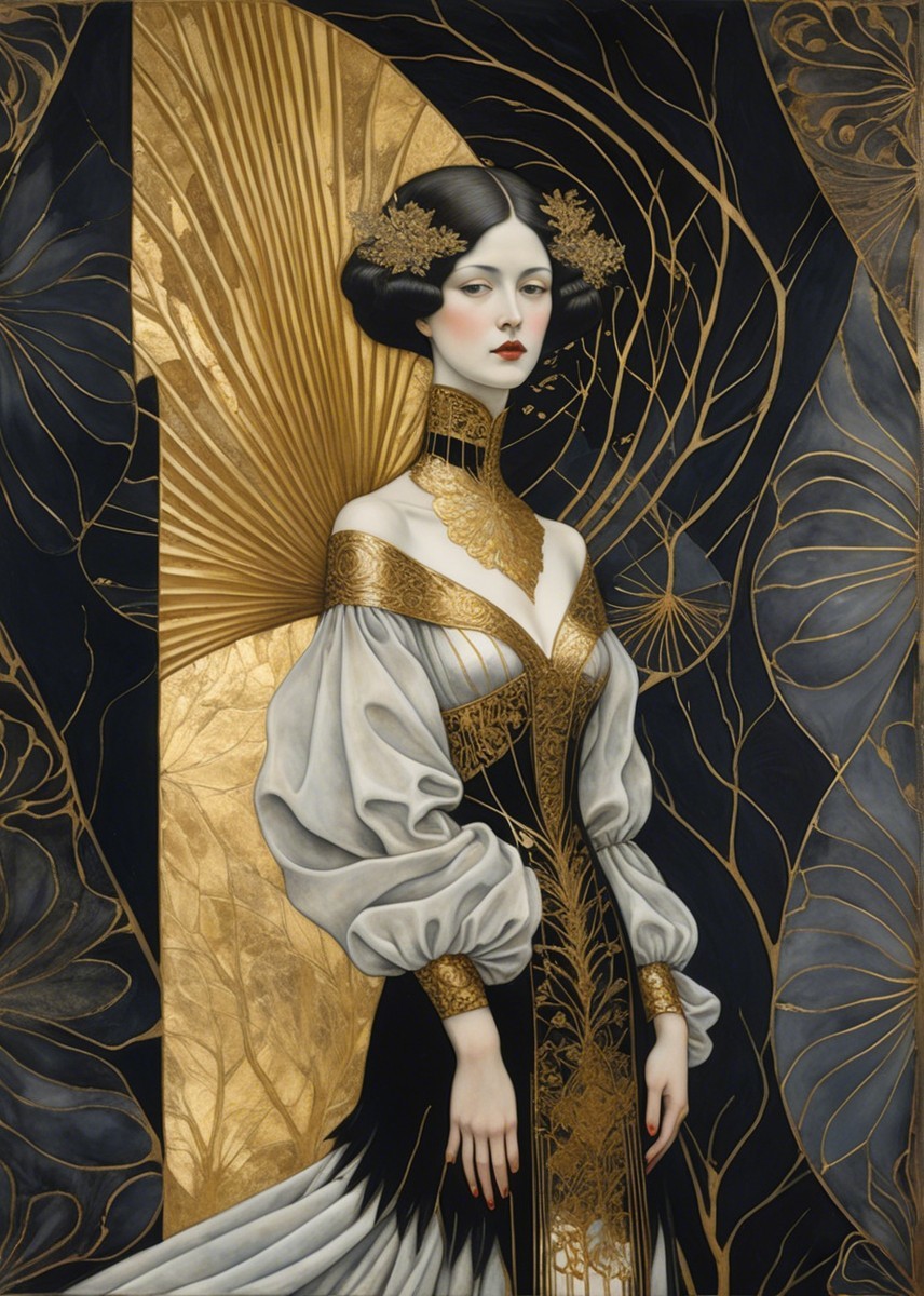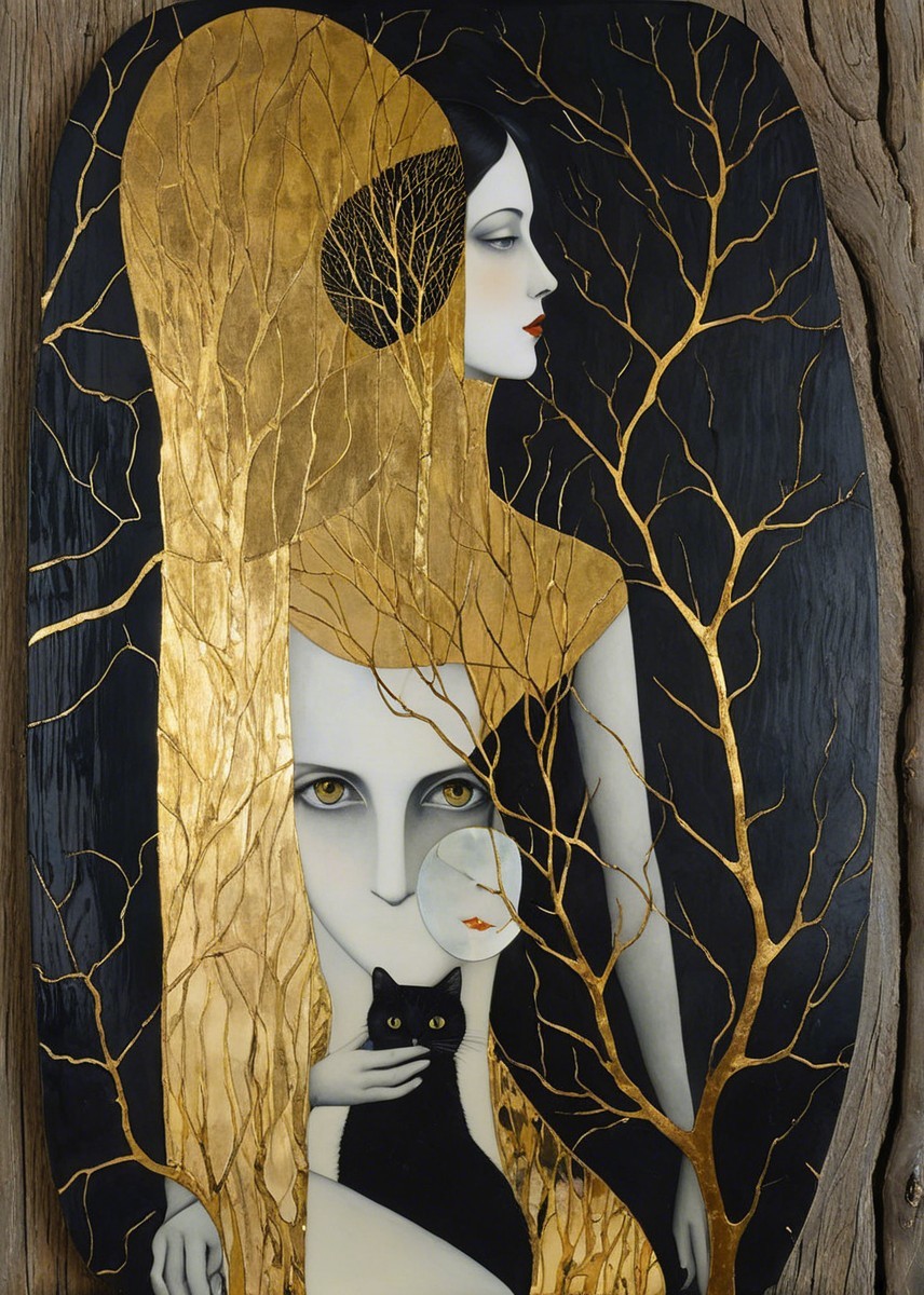 A woman in a black bodysuit holds a gray bird, surrounded by golden branches against a dark background. Her expression is serene, with a shimmering gold collar adding elegance to the composition.