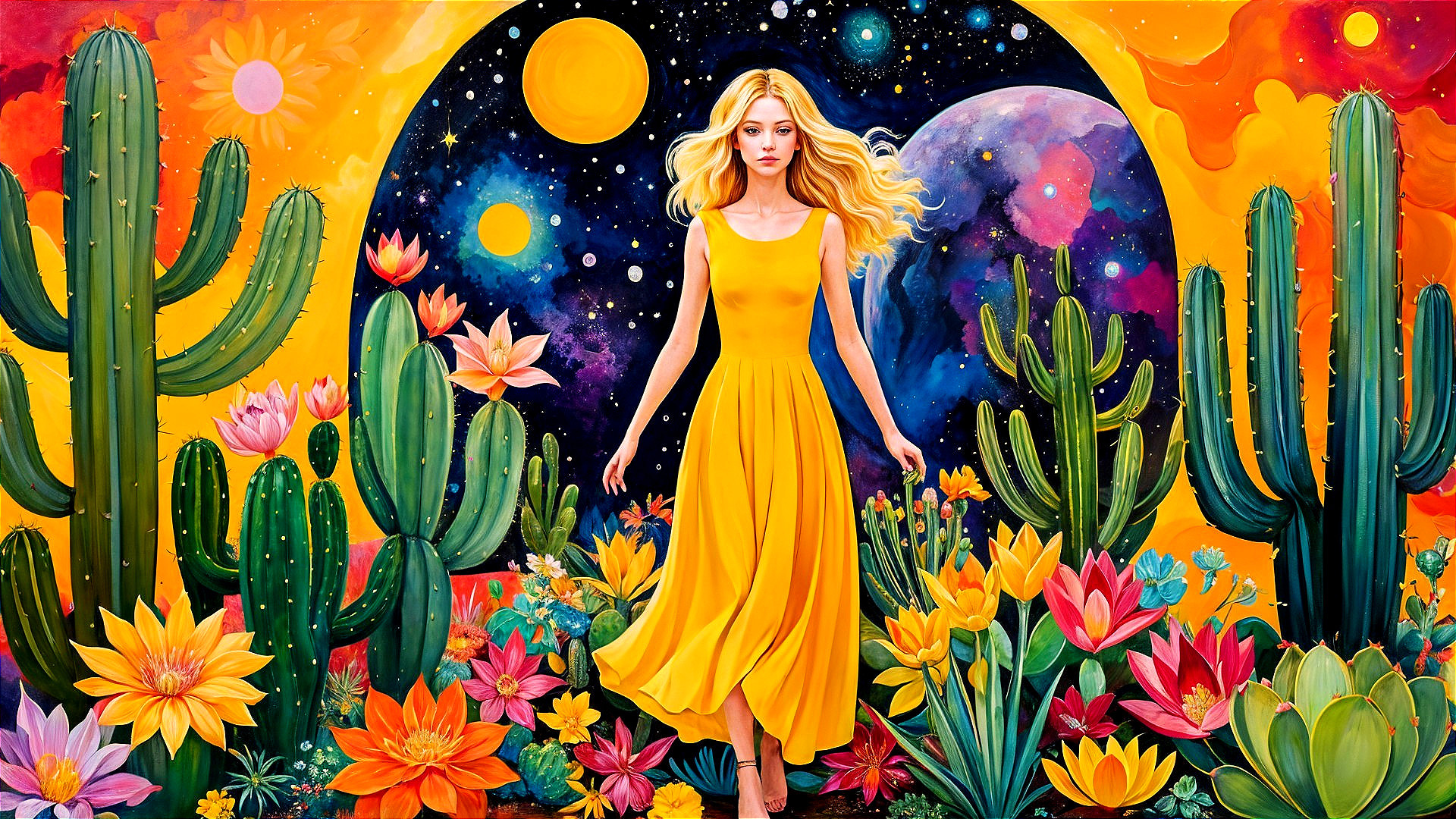 A woman in a long flowing yellow dress walks in an ethereal desert landscape with tall cactuses and blooming cactus flowers in various vibrant colors including pink, yellow, and orange. The background is split between a bright yellow and orange sky with a sun-like disk and a fantastical night sky filled with stars