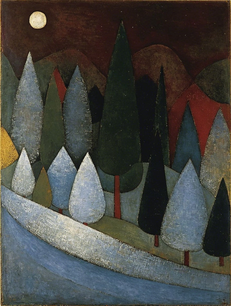 A serene scene featuring silhouettes of two figures walking along a misty path, surrounded by tall, dark trees. The moon glimmers softly, enhancing the tranquil, atmospheric setting.
