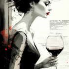 A glamorous woman in a black dress holds a glass of red wine, exuding sophistication. Her dark hair is elegantly styled, and her striking makeup adds to the allure of the scene.