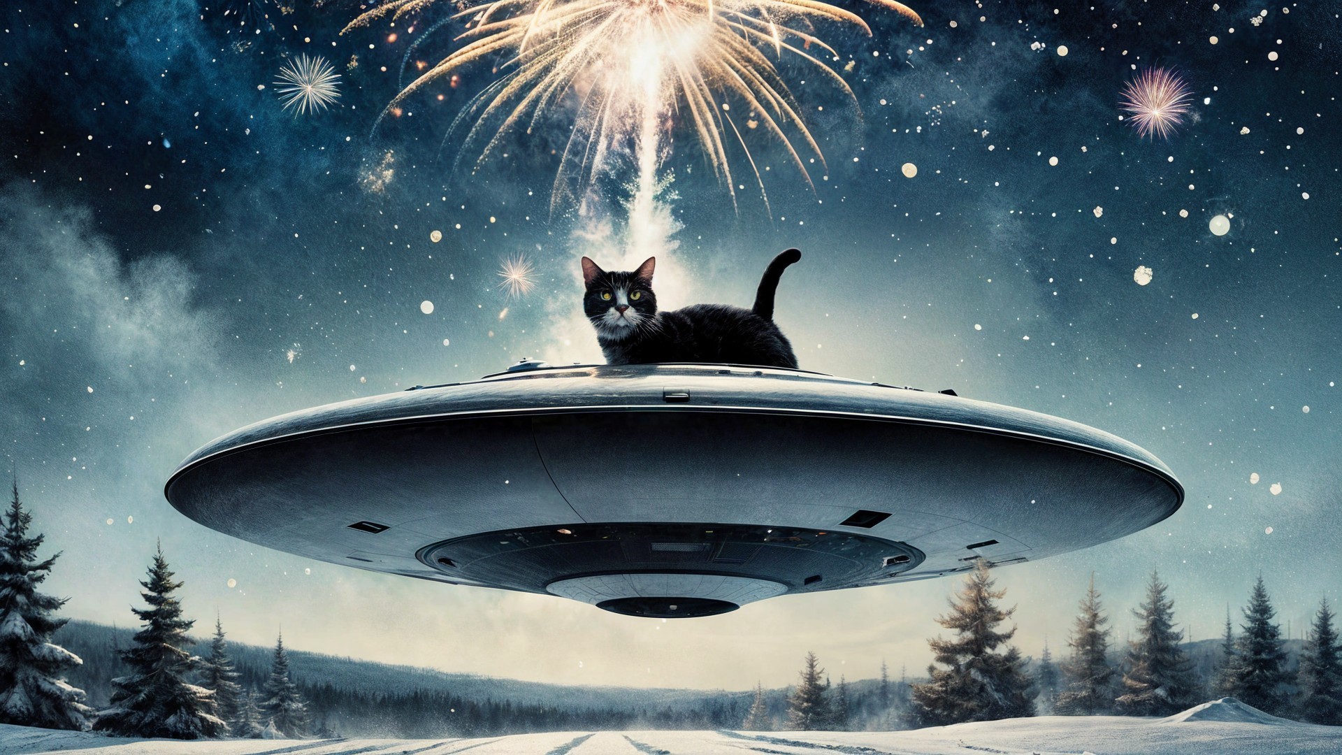 (Try from Djon) - A whimsical scene features a cat aboard a sleek UFO, soaring through a starry sky. Colorful fireworks illuminate the night, with a snowy landscape below, blending humor and cosmic adventure.