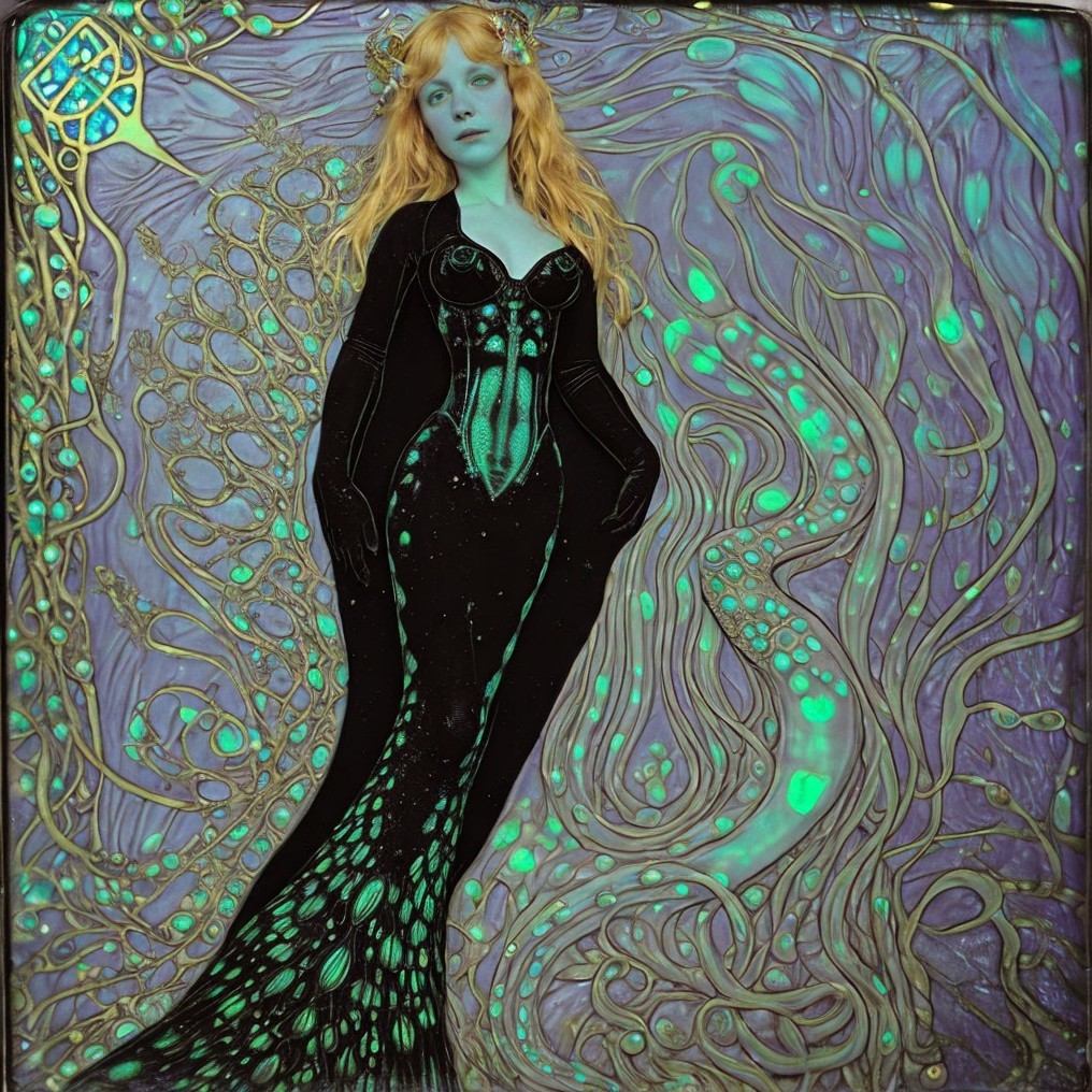 Ethereal woman in black and teal dress with serpent-like creature in stylized image