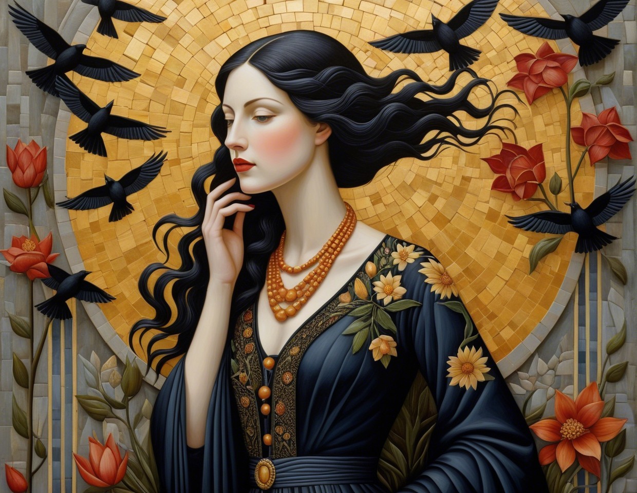 A stylized woman with flowing black hair and a serene expression is adorned with flowers and a pearl necklace, surrounded by birds and vibrant roses against a golden mosaic background.