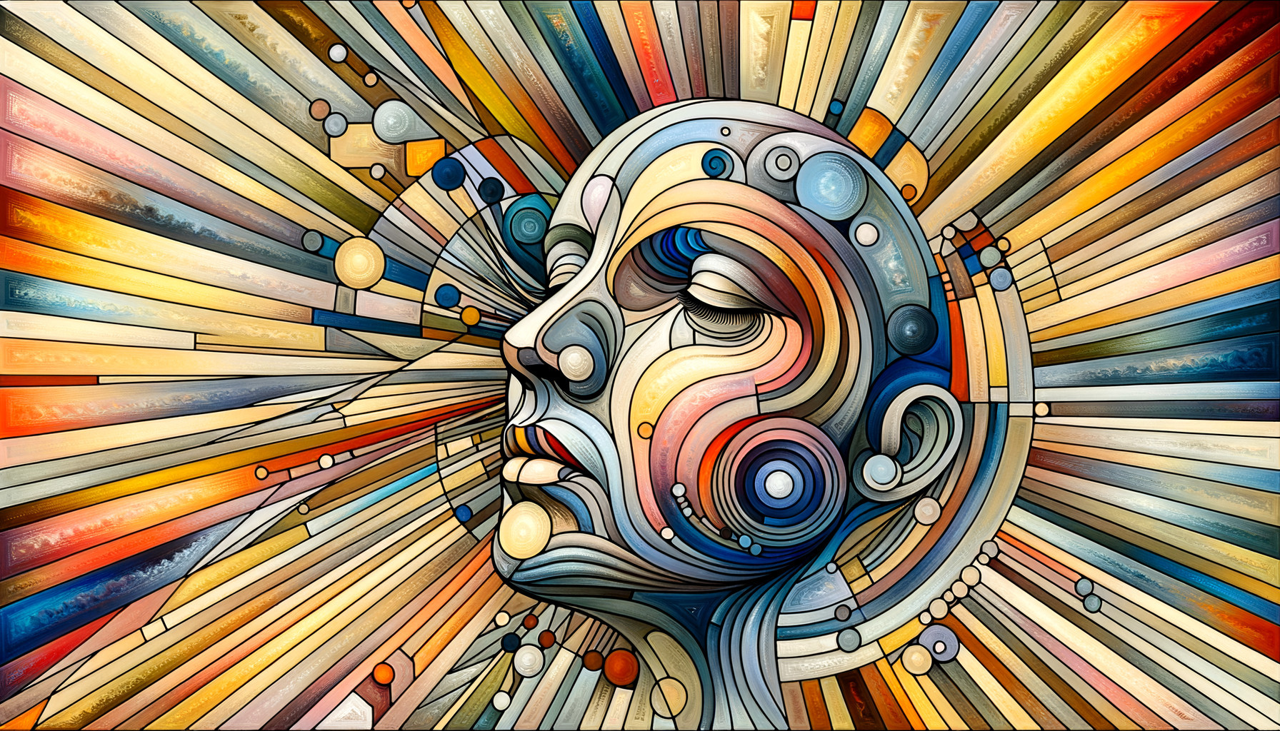 A sleeping baby with a serene expression, surrounded by abstract yellow and blue radial patterns.