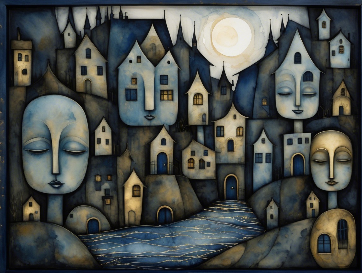 The artwork features a surreal village scene with abstract, large-faced figures and geometrically shaped houses, all painted in shades of blue and gold, illuminated by a glowing moon.