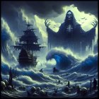 A majestic pirate ship sails through tumultuous waves under a dramatic sky, silhouetted against a golden sunset, while a lone figure stands on a rocky shore, watching the scene unfold.