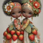 Two adorable, stylized dolls with curly hair are dressed in vibrant, strawberry-themed outfits. They stand closely together, surrounded by oversized strawberries, exuding joy and playfulness.