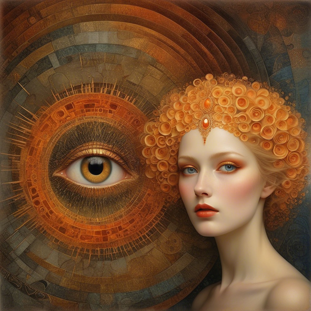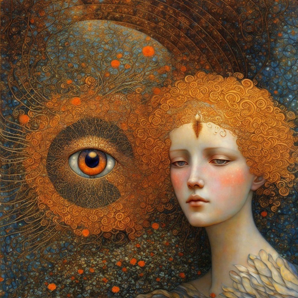 A serene woman with flowing hair adorned with orange flowers gazes thoughtfully. Behind her, an intricate design featuring an eye and celestial elements adds an air of mystery and enchantment.