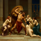 The scene depicts a muscular figure, resembling a hero or demigod, battling a fierce lion in a classical setting. Surrounding him are a group of captivated women, observing with varying emotions.