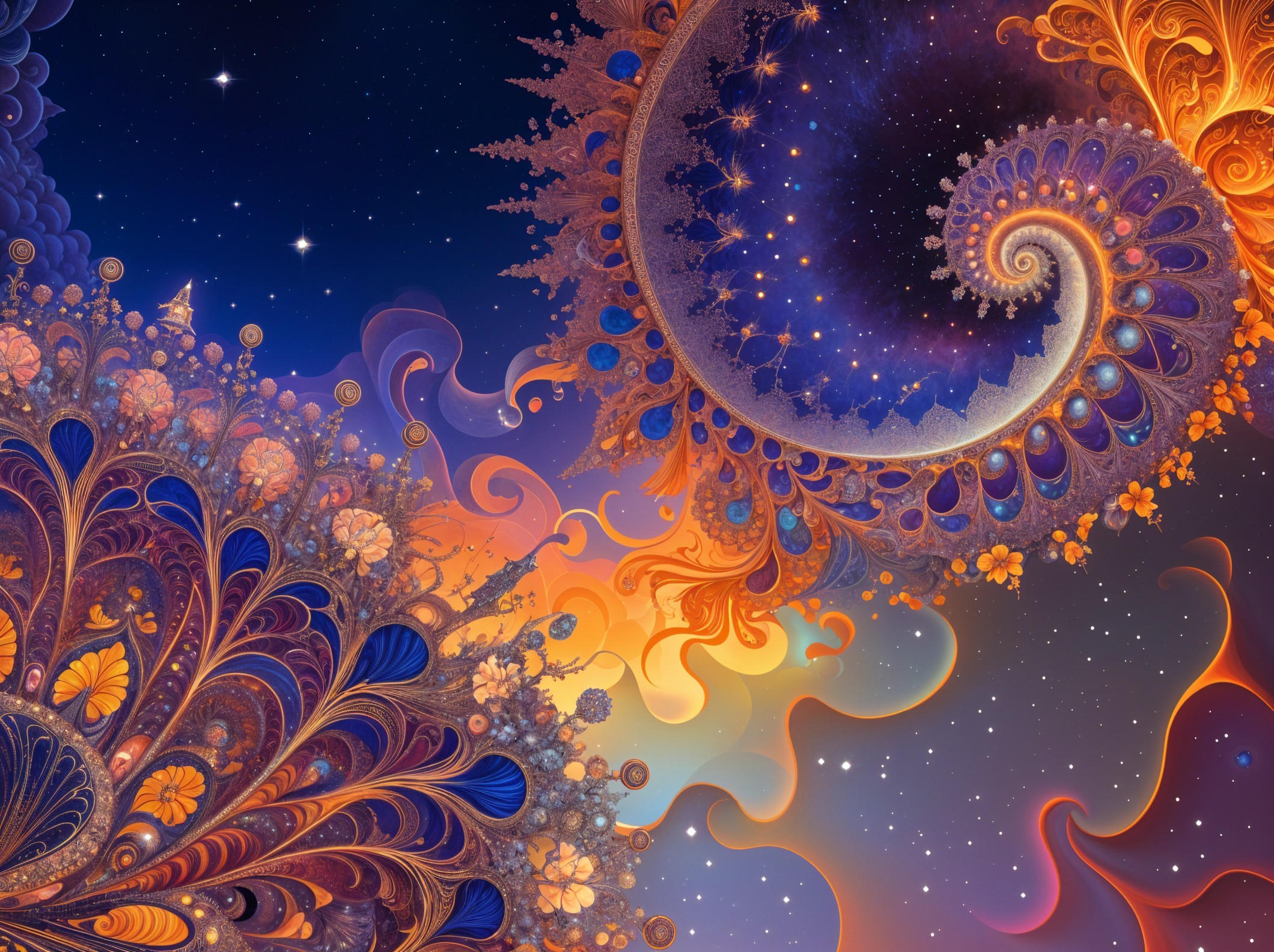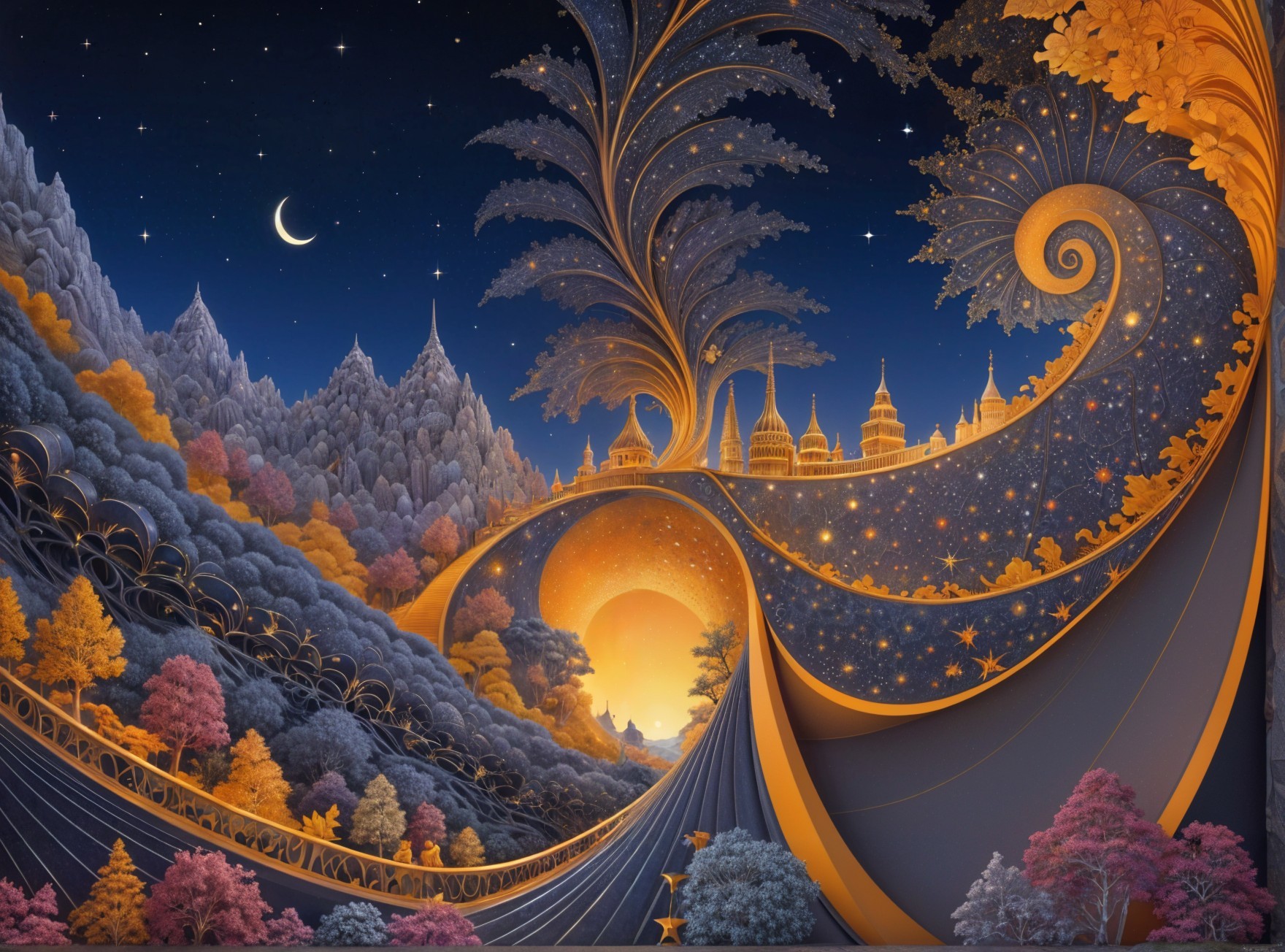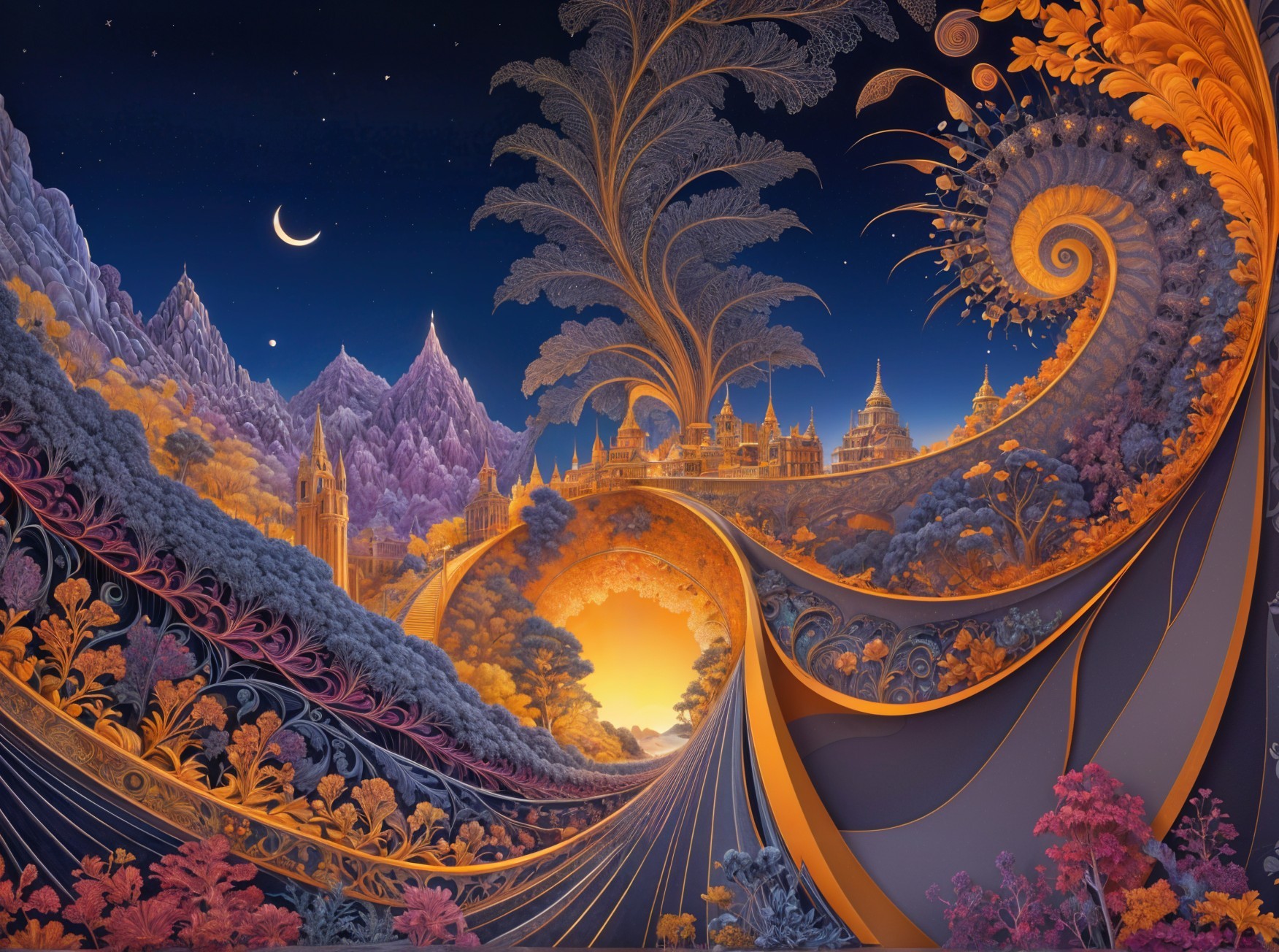 A mesmerizing landscape features intricate fractal patterns intertwining with a majestic castle under a starlit sky, exuding a dreamlike, otherworldly atmosphere filled with golden hues.