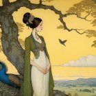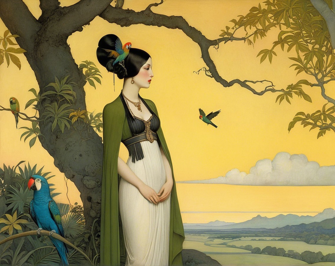 A serene woman in a black and white gown stands amidst lush greenery, adorned with parrots. The golden sunset casts a warm glow, enhancing the tranquil, tropical atmosphere.