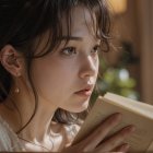 A young woman with long, wavy hair sits in a cozy cafe, holding a book. She has soft features, rosy cheeks, and wears delicate earrings, adding to the serene atmosphere of the space.