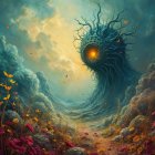 A surreal scene features colossal tendrils with a human-like face, surrounded by vibrant flowers and butterflies. A luminous, swirling sky above creates an otherworldly atmosphere.