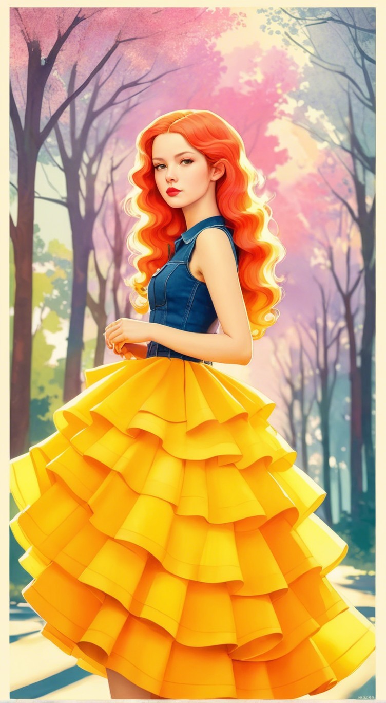 A young woman with vibrant red hair wears a stylish denim top and a flowing yellow ruffled skirt. She stands gracefully against a colorful forest backdrop, exuding confidence and charm.