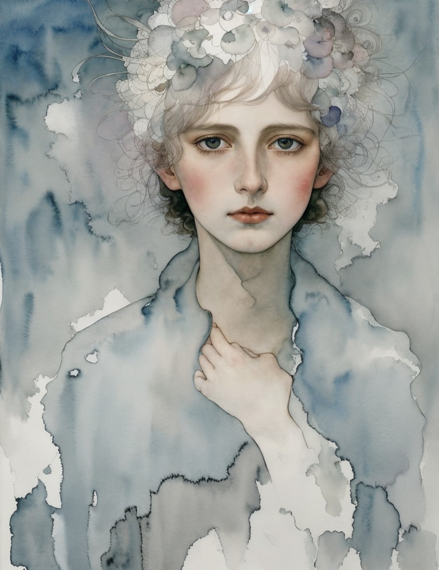 Illustration of a woman with curly hair, piercing blue eyes, and red lips set against a soft, cloudy backdrop.