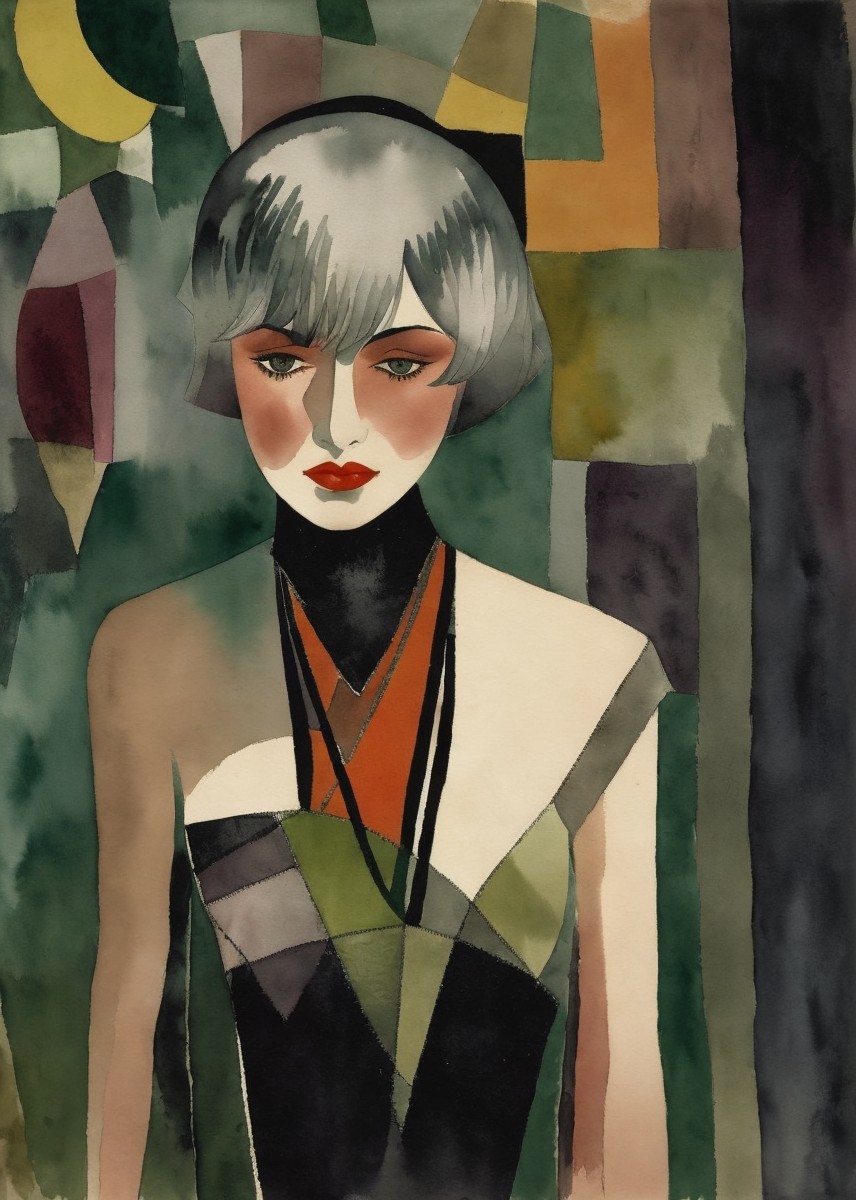 Stylized watercolor painting of woman with short hair, geometric shapes in the background, bold red lips, and dark attire.